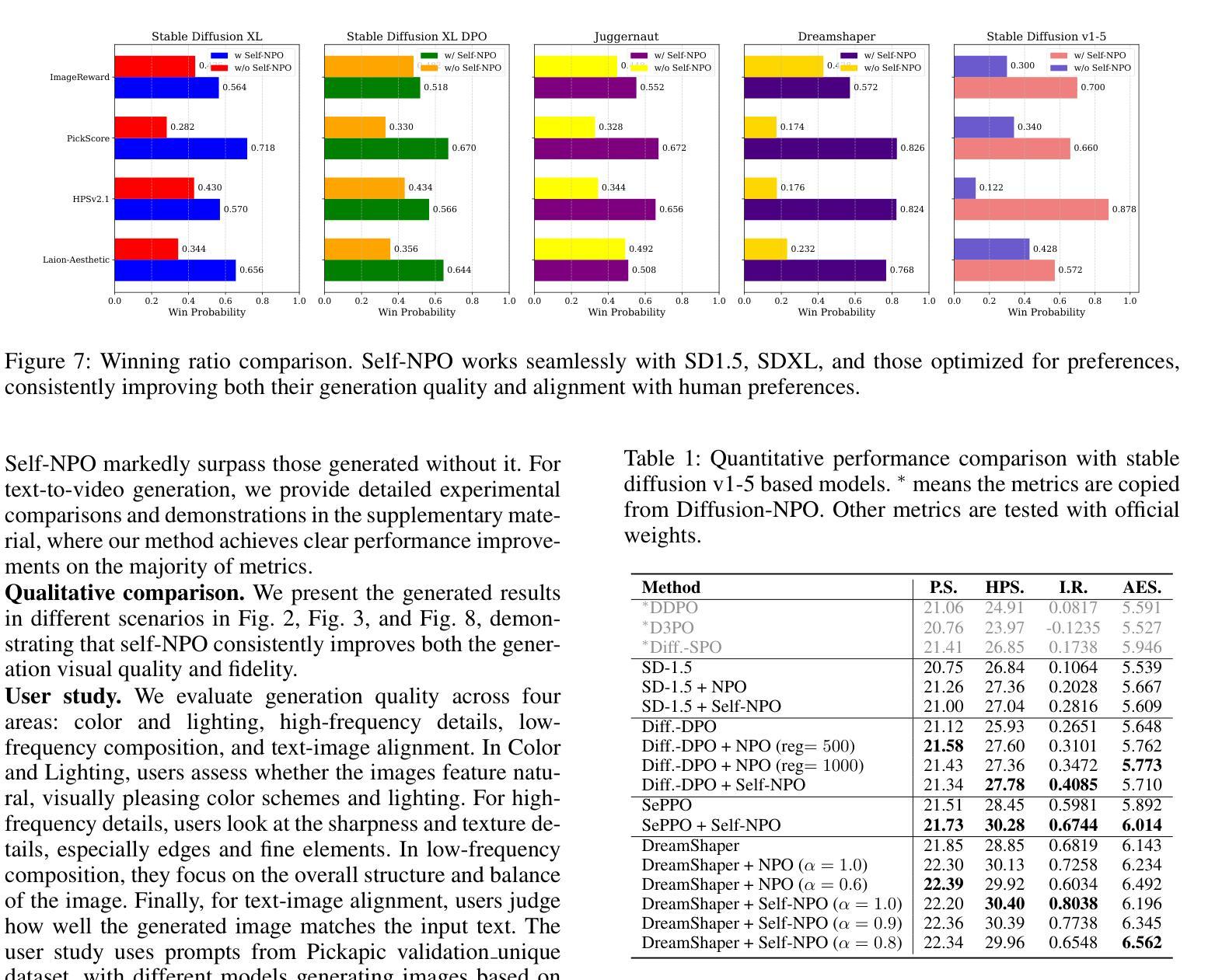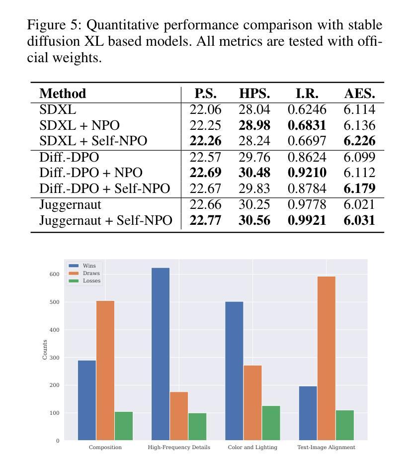 - Self-NPO方法高效,性能与Diffusion-NPO相当,并能提高生成质量和与人类偏好的一致性。