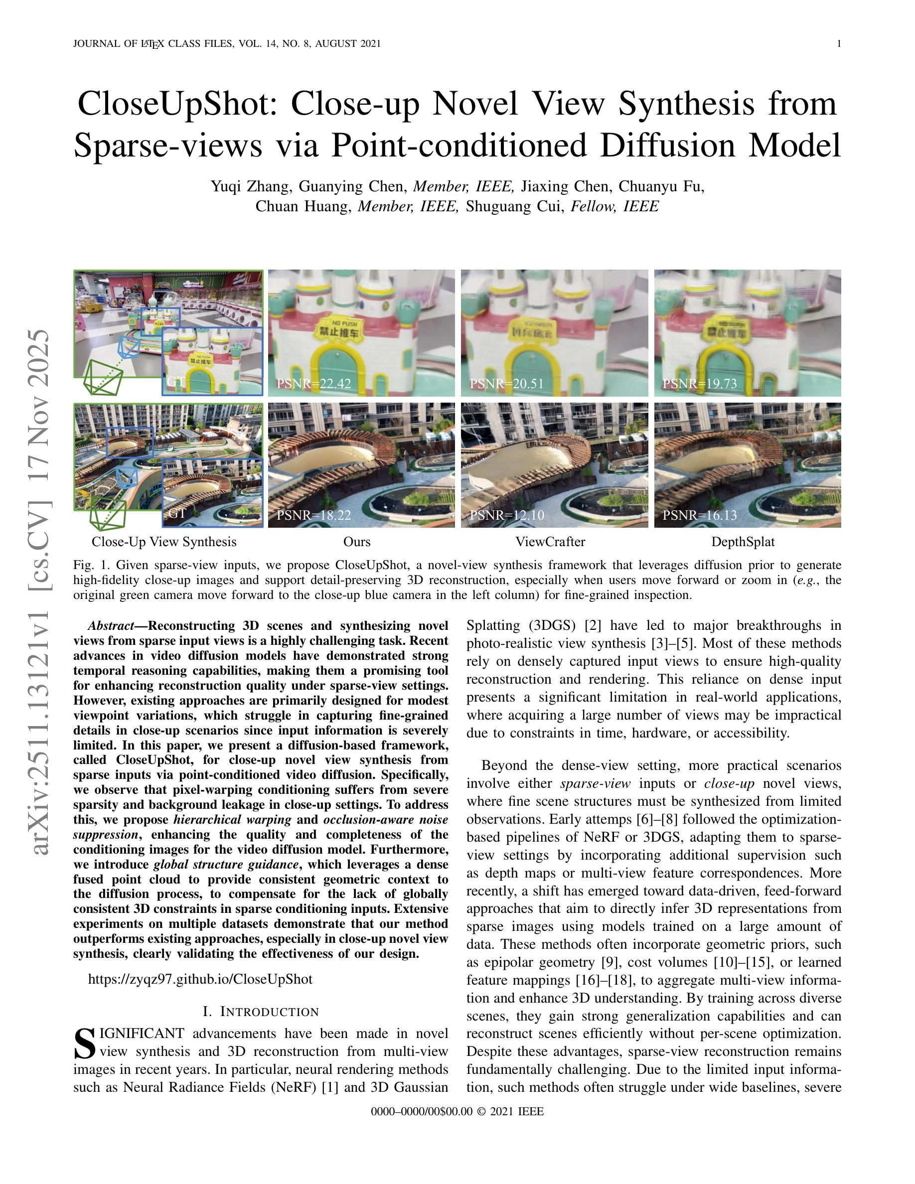 重建三维场景并从未知视角合成新型图像是一个极富挑战性的任务。最新的视频扩散模型展现出强大的时间推理能力,使其在稀疏视角条件下增强重建质量方面展现出巨大潜力。然而,现有方法主要针对视角变化不大的情况,难以捕捉近距离场景中的精细细节,因为输入信息严重受限。本文提出了一种基于扩散的框架CloseUpShot,通过点条件视频扩散从稀疏输入进行近距离新型视角合成。我们发现像素级扭曲条件在近距离设置中存在严重稀疏性和背景泄露问题。为解决此问题,我们提出层次扭曲和遮挡感知噪声抑制技术,提升视频扩散模型的参考图像质量和完整性。此外,我们引入全局结构引导,利用密集融合点云为扩散过程提供一致的几何上下文,以弥补稀疏条件输入中缺乏全局一致的3D约束。在多个数据集上的广泛实验表明,我们的方法优于现有技术,特别是在近距离新颖视角合成方面,验证了我们的设计有效性。