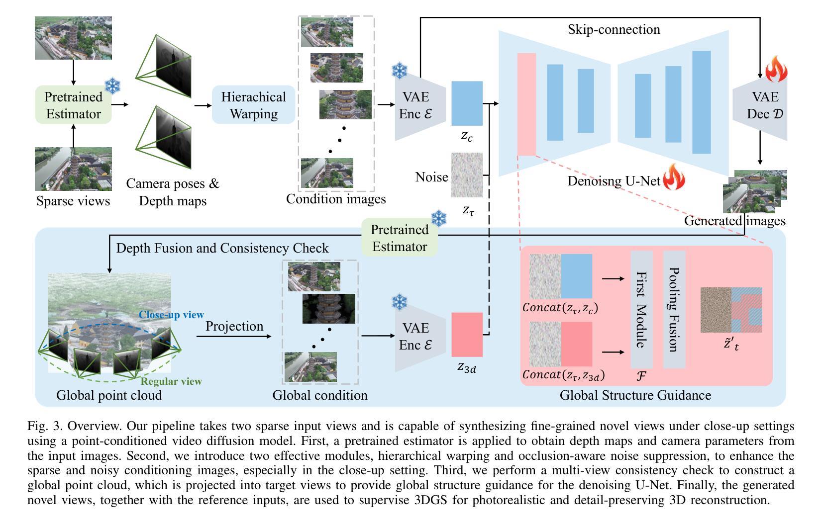 - 通过引入全局结构引导,利用密集融合点云提供一致的几何上下文,弥补稀疏输入中的全局3D约束缺失。