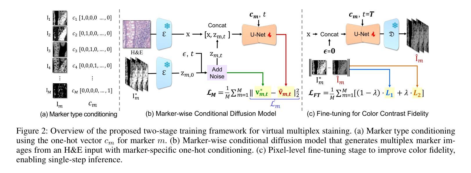 多路成像技术能够通过在组织样本中同时可视化多个生物标志物,为病理学带来革命性的变革,提供分子水平的见解,这是传统的苏木精和伊红(H&E)染色无法提供的。然而,多路数据获取的复杂性和成本阻碍了其广泛采用。此外,大多数现有的H&E图像大型存储库缺少相应的多路图像,限制了多模式分析的机会。为了解决这些挑战,我们利用潜在扩散模型(LDM)的最新进展,该模型通过利用强大的先验知识对目标领域进行微调,擅长对复杂数据分布进行建模。在本文中,我们介绍了一种利用预训练的LDM参数生成多路图像的新框架,该框架使用条件扩散模型从H&E图像生成多路图像。我们的方法通过针对每个标志物对扩散模型进行条件处理来生成标志物,同时共享所有标志物的相同架构。为了解决不同标志染色之间像素值分布的变化并加快推理速度,我们对模型进行了单步采样的微调,通过像素级损失函数提高了颜色对比度和保真度以及推理效率。我们在两个公开可用的数据集上验证了我们的框架,显著证明了其在生成多达18种不同类型的标志物方面的有效性,准确性有所提高,与以前的方法相比实现了大量的标志物类型增长。这一验证突显了我们框架的潜力,开创了虚拟多路染色的先河。最后,本文架起了H&E和多路成像之间的桥梁,有望实现对现有H&E图像存储库的回顾性研究和大规模分析。