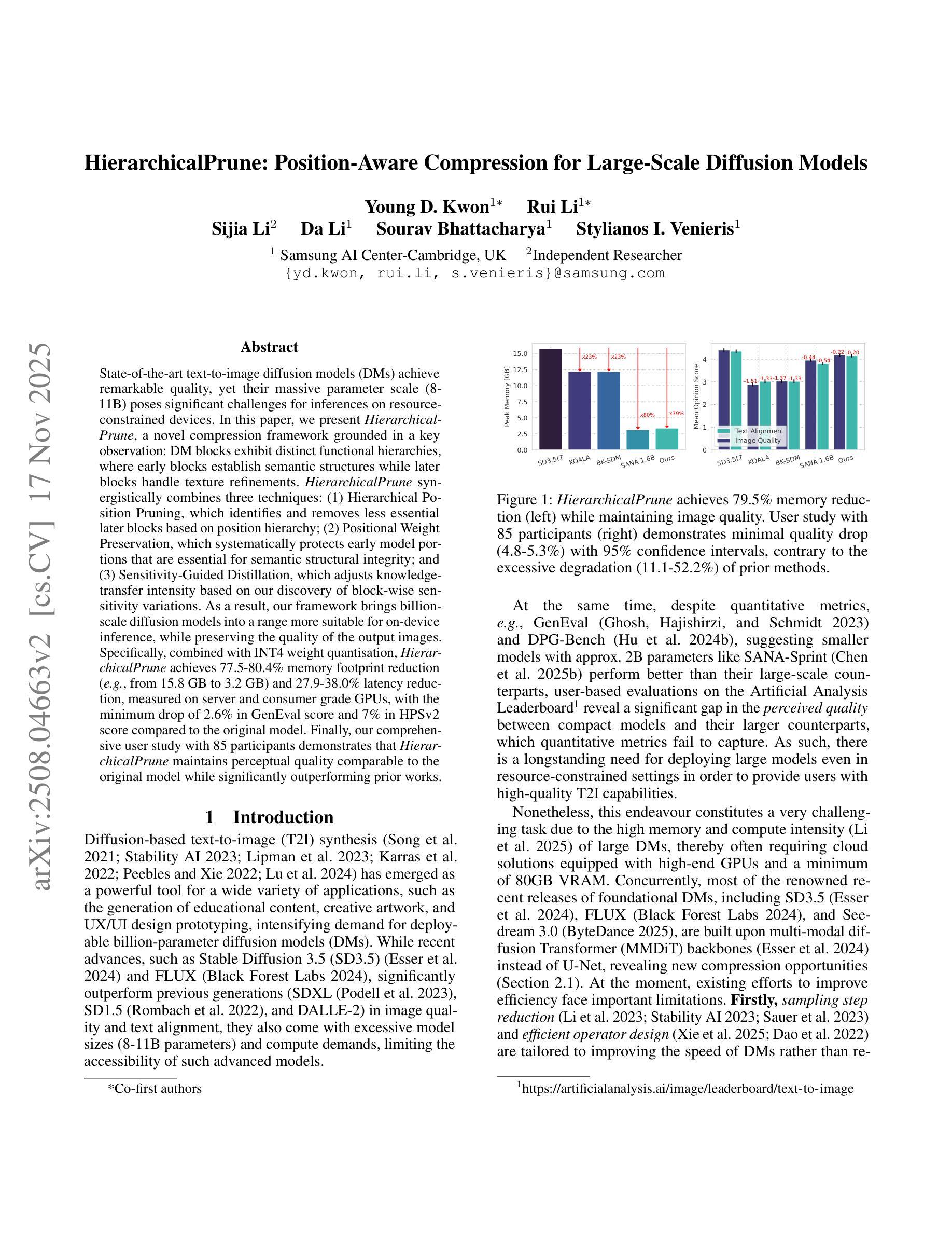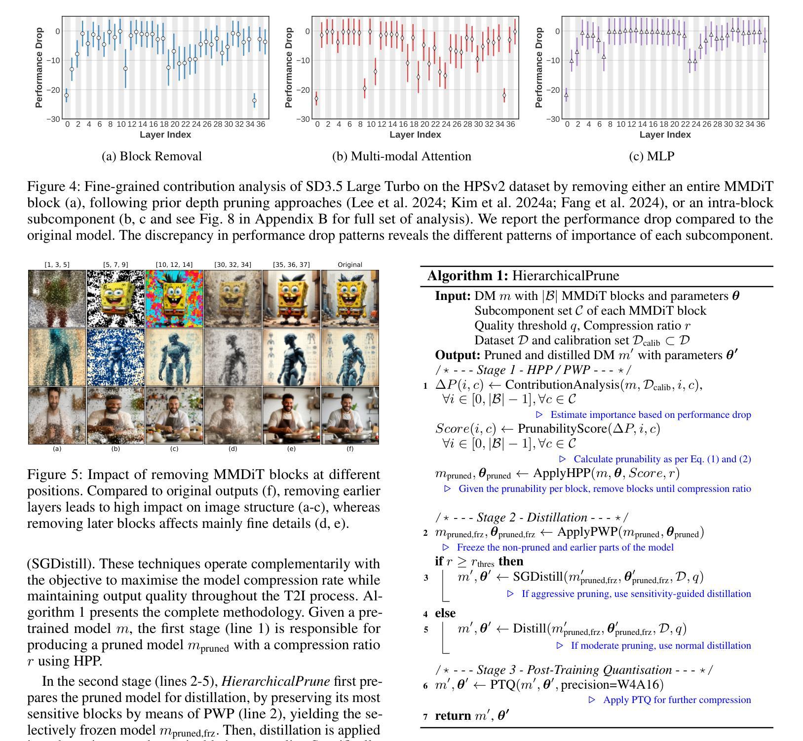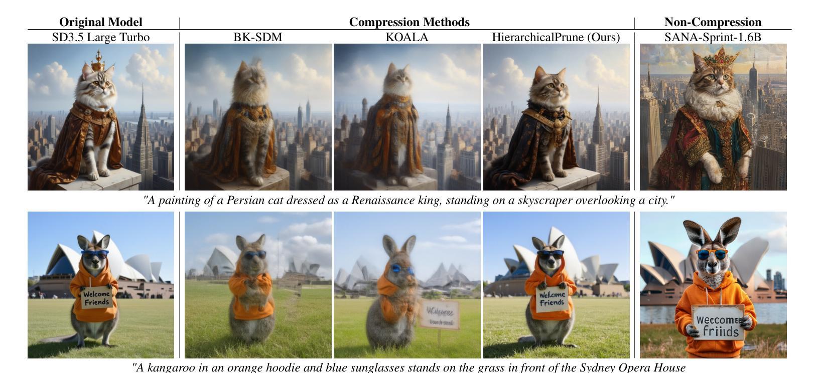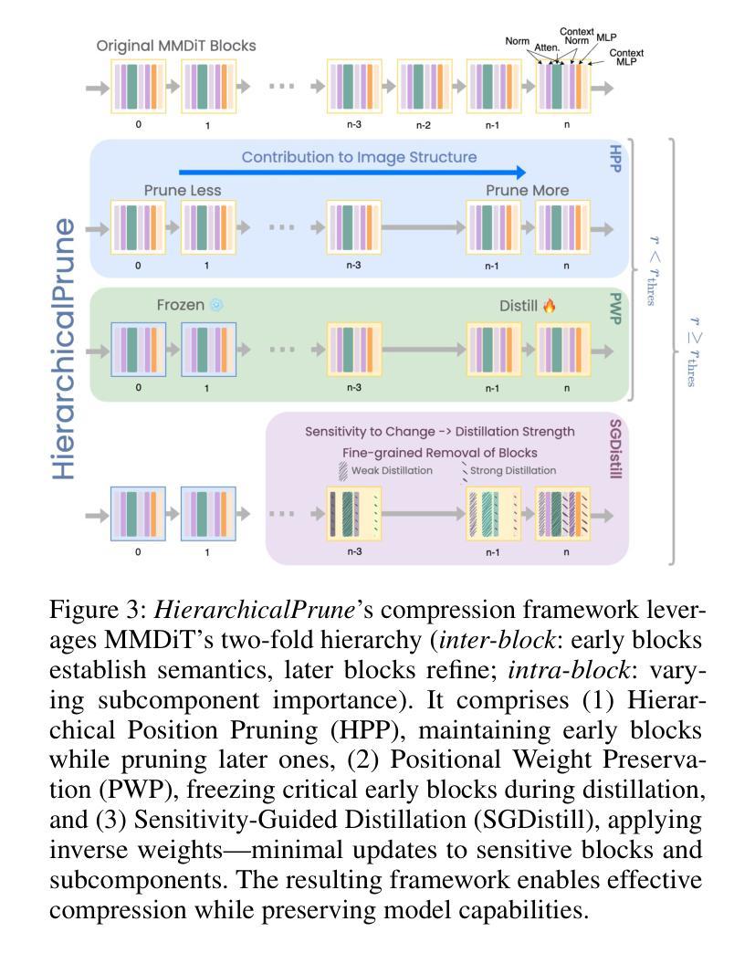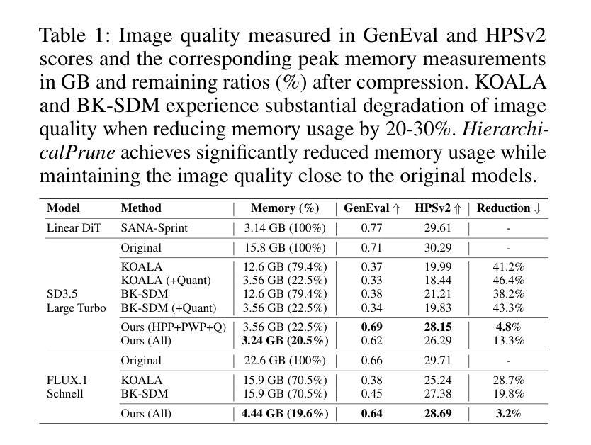 先进文本到图像扩散模型(DMs)达到了显著的质量水平,然而其庞大的参数规模(8-11B)对资源受限设备上的推理构成了重大挑战。在本文中,我们提出了HierarchicalPrune,这是一种新的压缩框架,它基于一个关键观察:DM块表现出不同的功能层次,早期块建立语义结构,而后期块处理纹理细化。HierarchicalPrune协同结合了三种技术:(1)层次位置剪枝,它根据位置层次识别并移除不太重要的后期块;(2)位置权重保留,它系统地保护早期模型部分,对于语义结构完整性至关重要;(3)敏感度引导蒸馏,它根据我们发现的块级敏感度变化调整知识转移强度。因此,我们的框架将规模庞大的扩散模型引入到更适合于设备端推理的范围,同时保持输出图像的质量。具体来说,结合INT4权重量化,HierarchicalPrune实现了77.5-80.4%的内存占用减少(例如,从15.8 GB减少到3.2 GB),在服务器和消费级GPU上测量的延迟减少了27.9-38.0%,与原始模型相比,GenEval得分最低下降了2.6%,HPSv2得分下降了7%。最后,我们的综合用户研究,共有85名参与者,证明HierarchicalPrune在保持与原始模型相当的可感知质量的同时,显著优于先前的工作。