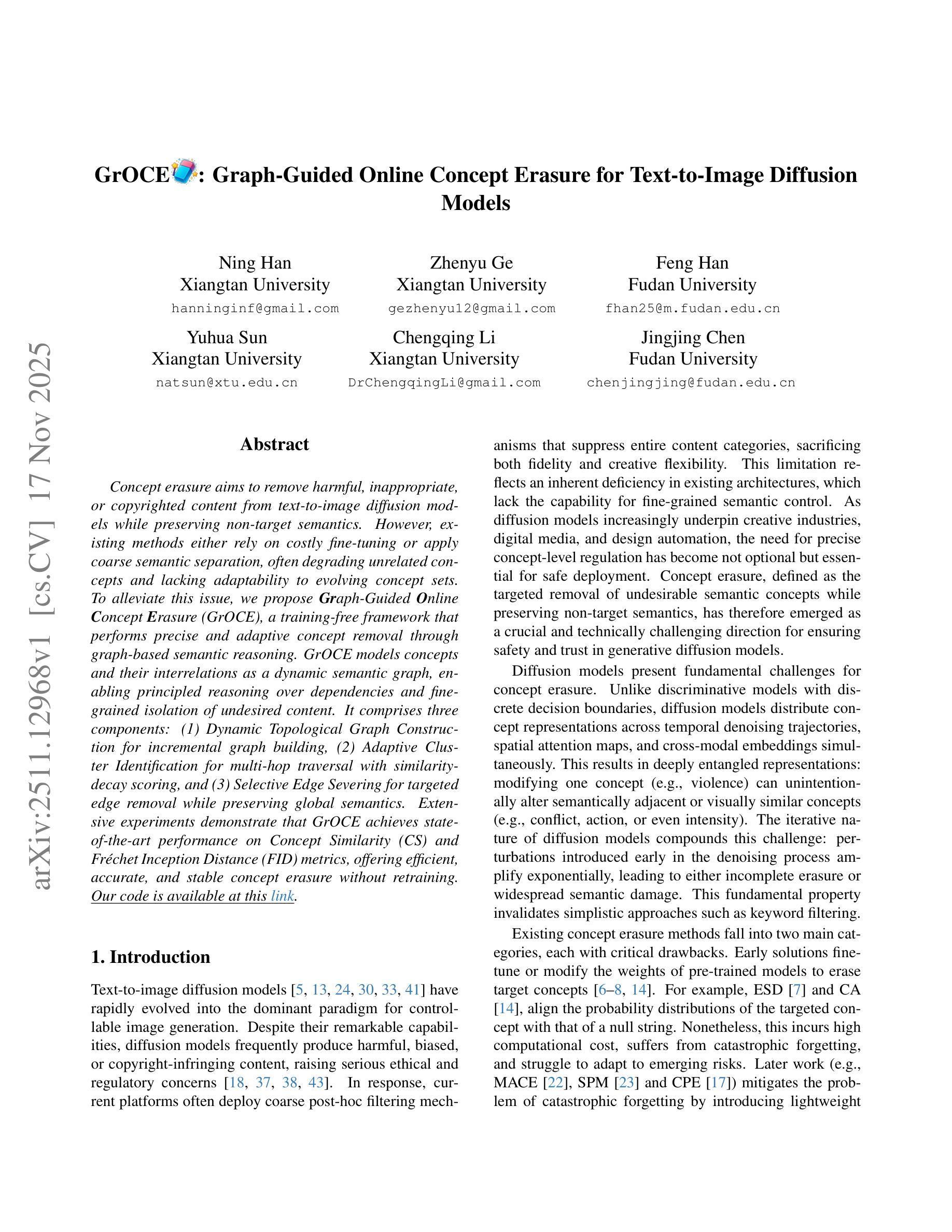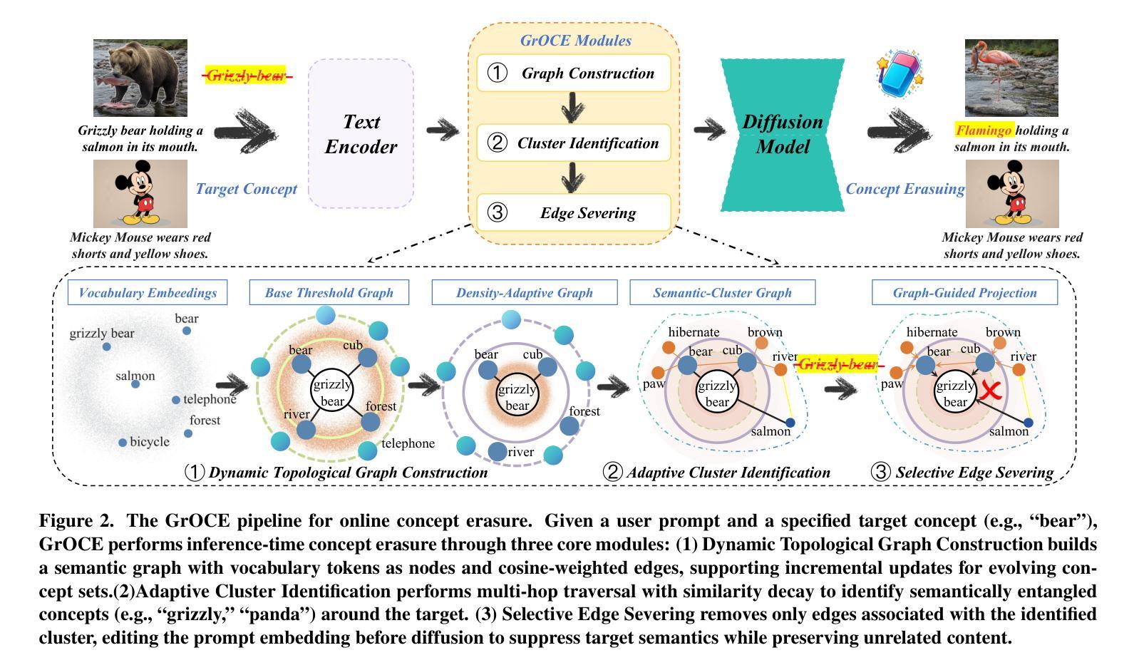 文本介绍了概念擦除技术在文本到图像扩散模型中的应用,旨在去除有害、不合适或版权内容,同时保留非目标语义。针对现有方法的局限性,提出了一种名为Graph-Guided Online Concept Erasure (GrOCE)的新框架,该框架采用基于图的语义推理进行精确和自适应的概念去除,无需重新训练即可应对不断变化的概念集。