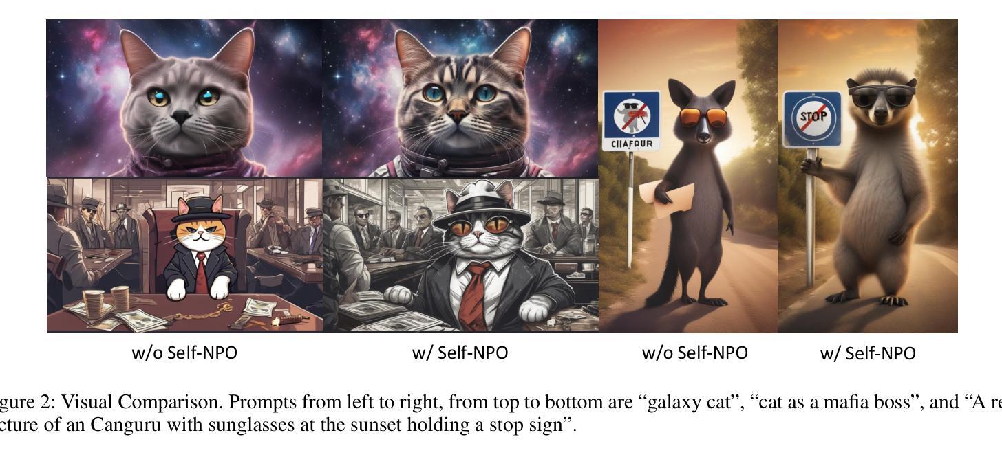 本文介绍了扩散模型在视觉生成任务中的出色表现,以及偏好优化(PO)在这一领域的重要性。文章重点介绍了Diffusion-NPO中的负偏好优化(NPO),它通过训练模型生成与人类偏好相反的输出,通过分类器免费的指导(CFG)来避免不良结果。然而,现有的NPO方法依赖于获取明确偏好注释的昂贵和脆弱程序,限制了其在数据稀缺或难以获取的领域中的实用性。因此,本文提出了Self-NPO,这是一种通过直接学习模型本身的负偏好优化的数据免费方法,无需手动数据标记或奖励模型训练。该方法高效且性能与Diffusion-NPO相当,并能无缝集成到广泛使用的扩散模型中,包括SD1.5、SDXL和CogVideoX等,提高生成质量和与人类偏好的一致性。