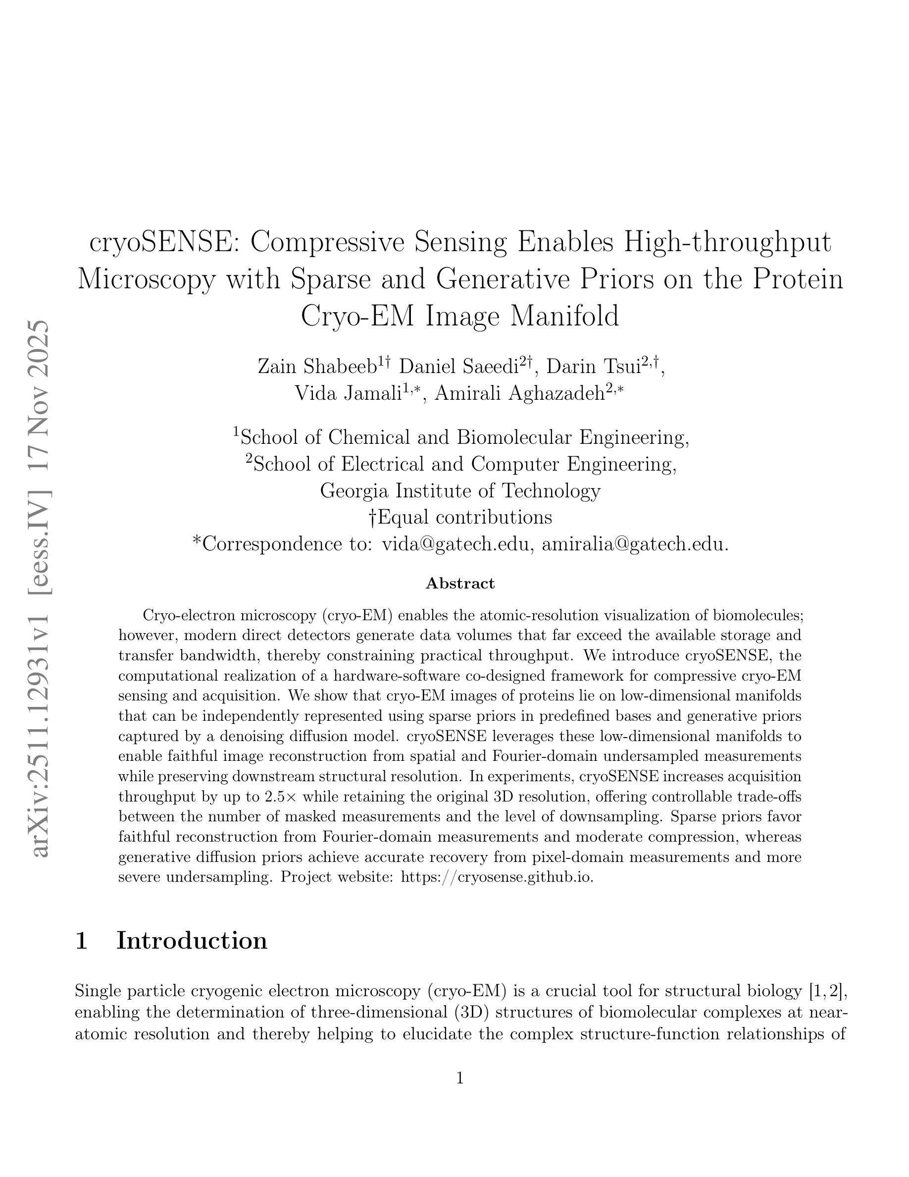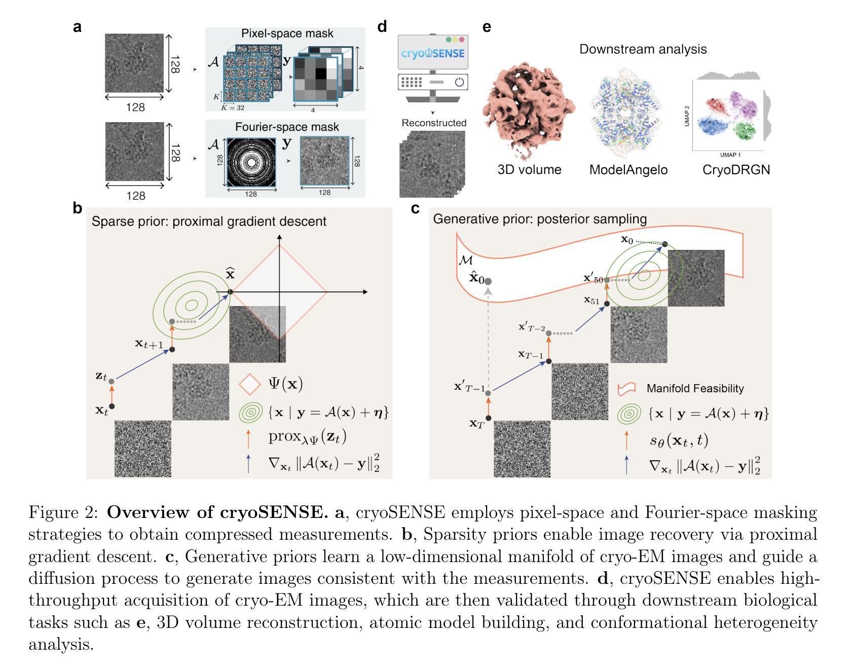 冷冻电子显微镜(cryo-EM)能够实现生物分子的原子分辨率可视化;然而,现代直接探测器生成的数据量远远超过了可用的存储和传输带宽,从而限制了实际吞吐量。我们引入了cryoSENSE,这是硬件和软件协同设计框架的计算实现,用于压缩冷冻电子显微镜(cryo-EM)感知和采集。我们证明蛋白质冷冻电子显微镜图像位于低维流形上,可以使用预定义基中的稀疏先验和由降噪扩散模型捕获的生成先验进行独立表示。cryoSENSE利用这些低维流形实现从空间和傅里叶域欠采样测量进行忠实图像重建,同时保留下游结构分辨率。在实验中,cryoSENSE将采集速度提高了高达2.5倍,同时保持了原始的3D分辨率,在掩膜测量的数量和欠采样的程度之间实现了可控的权衡。稀疏先验有利于从傅里叶域测量和适度压缩中实现忠实重建,而生成扩散先验则可从像素域测量和更严重的欠采样中实现准确恢复。项目网站:https://cryosense.github.io。