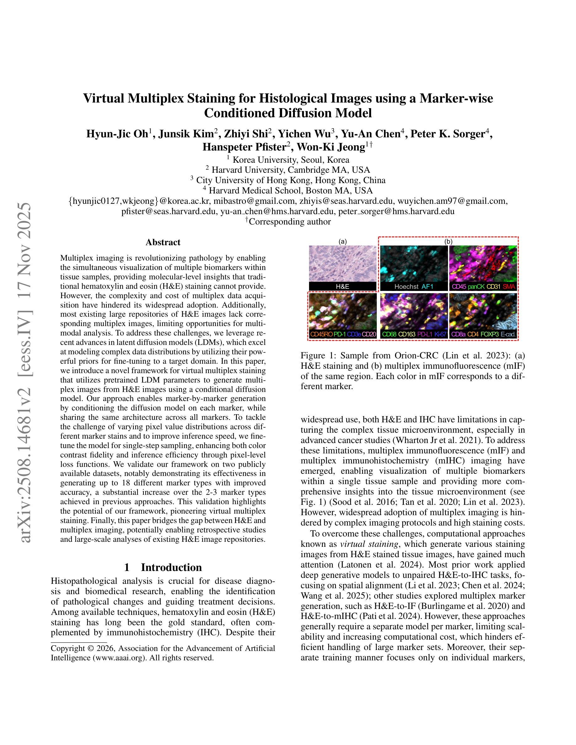 在病理学中,多重成像技术能够通过同时可视化组织样本中的多个生物标志物,为分子水平的洞察提供前所未有的能力,这是传统的苏木精和伊红(H&E)染色无法实现的。然而,多重数据获取的复杂性和成本阻碍了其广泛应用。为了克服这一挑战,本研究利用潜伏扩散模型(LDM)的最新进展,提出了一种虚拟多重染色的新型框架,该框架可从H&E图像生成多重图像。本研究的方法能够通过针对每个标记物对扩散模型进行条件化,同时在所有标记物之间共享相同的架构,实现逐标记的生成。此外,本研究还解决了不同标记物染色像素值分布不均的问题,提高了推理速度。在公开数据集上的验证表明,该方法生成了多达18种不同的标记类型,准确性显著提高,远超以前方法实现的2-3种标记类型。该研究为虚拟多重染色开辟了新的途径,并有望缩小H&E染色与多重成像之间的差距。