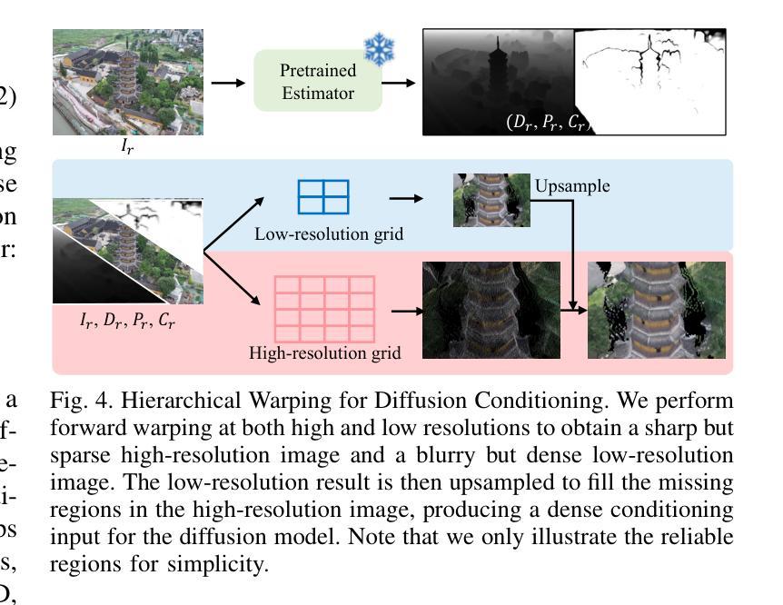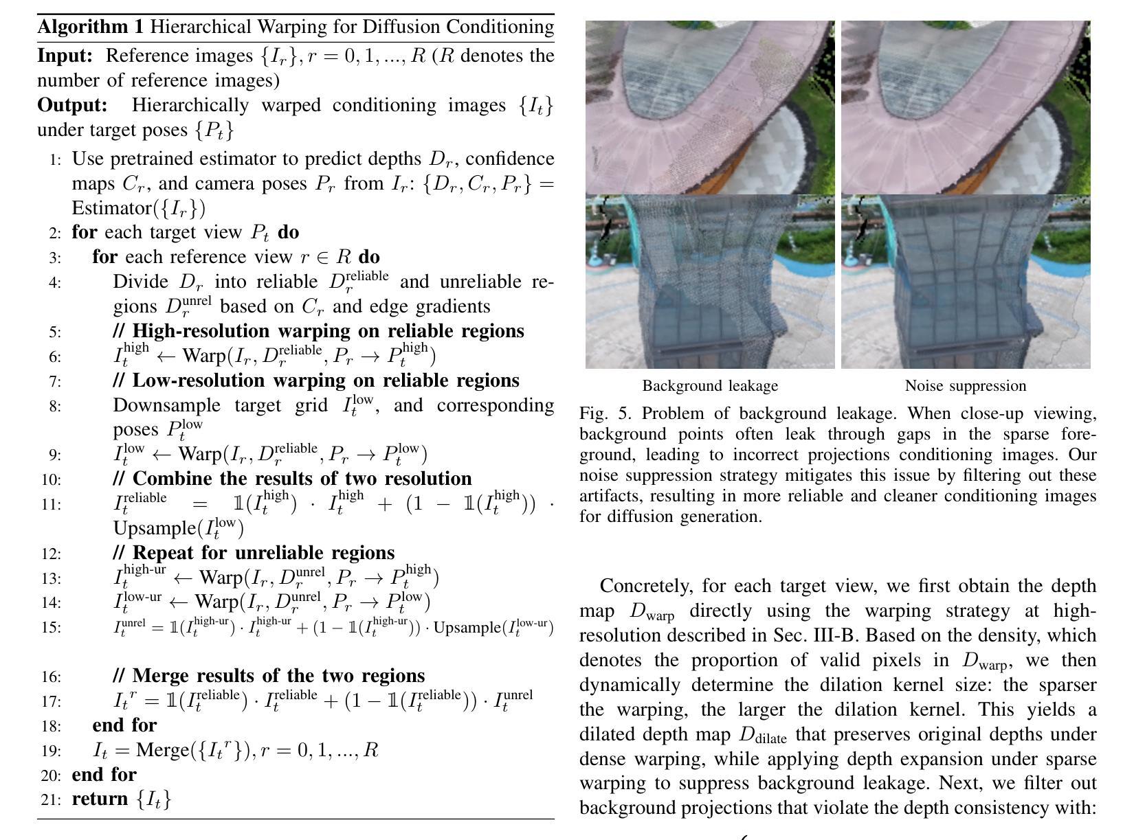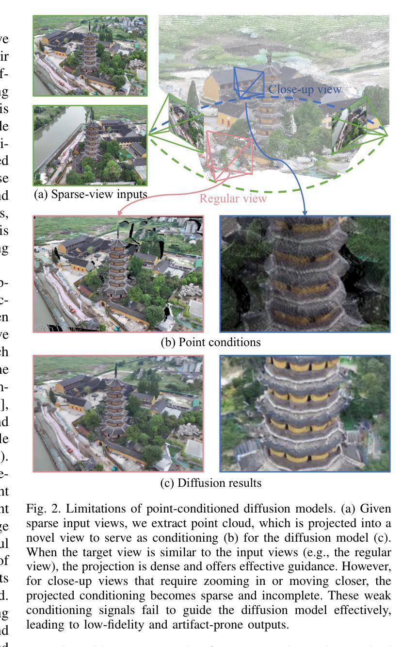 从稀疏的输入视角重建3D场景并合成新的视角是一项极具挑战性的任务。视频扩散模型的最新进展表现出了强大的时间推理能力,使其成为稀疏视图设置下提高重建质量的有前途的工具。然而,现有方法主要设计用于适度的视点变化,它们在捕捉近距离场景的精细细节方面遇到困难,因为输入信息严重受限。在本文中,我们提出了一种基于扩散的框架,称为CloseUpShot,通过点条件视频扩散进行近距离新颖视图合成。具体来说,我们发现像素warp条件在近距离设置中存在严重的稀疏性和背景泄漏问题。为了解决这个问题,我们提出了层次warp和遮挡感知噪声抑制,提高了视频扩散模型的条件图像的质量和完整性。此外,我们引入了全局结构指导,利用密集融合点云为扩散过程提供一致的几何上下文,以弥补稀疏条件输入中缺乏全局一致的3D约束。在多个数据集上的大量实验表明,我们的方法优于现有方法,特别是在近距离新颖视图合成方面,这清楚地验证了我们的设计的有效性。