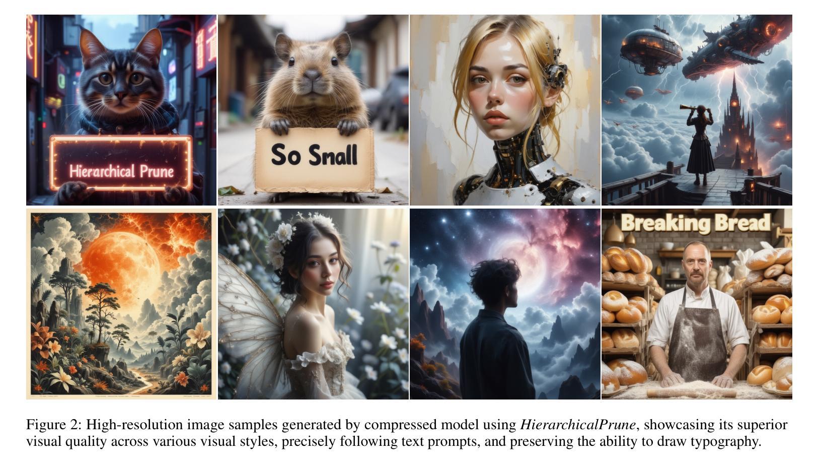 - HierarchicalPrune是一种针对文本到图像扩散模型的压缩框架,基于模型块的功能层次结构进行设计。