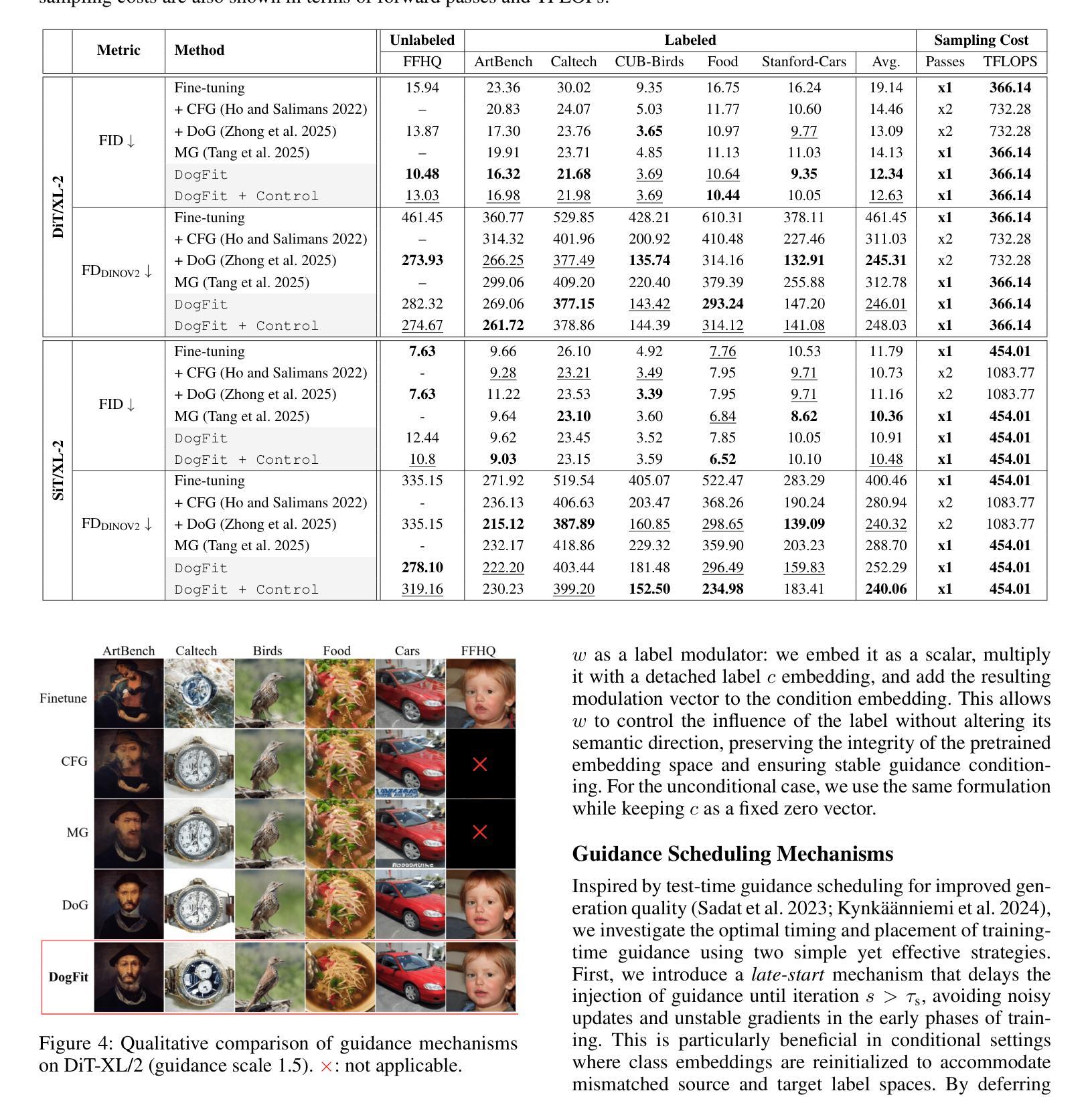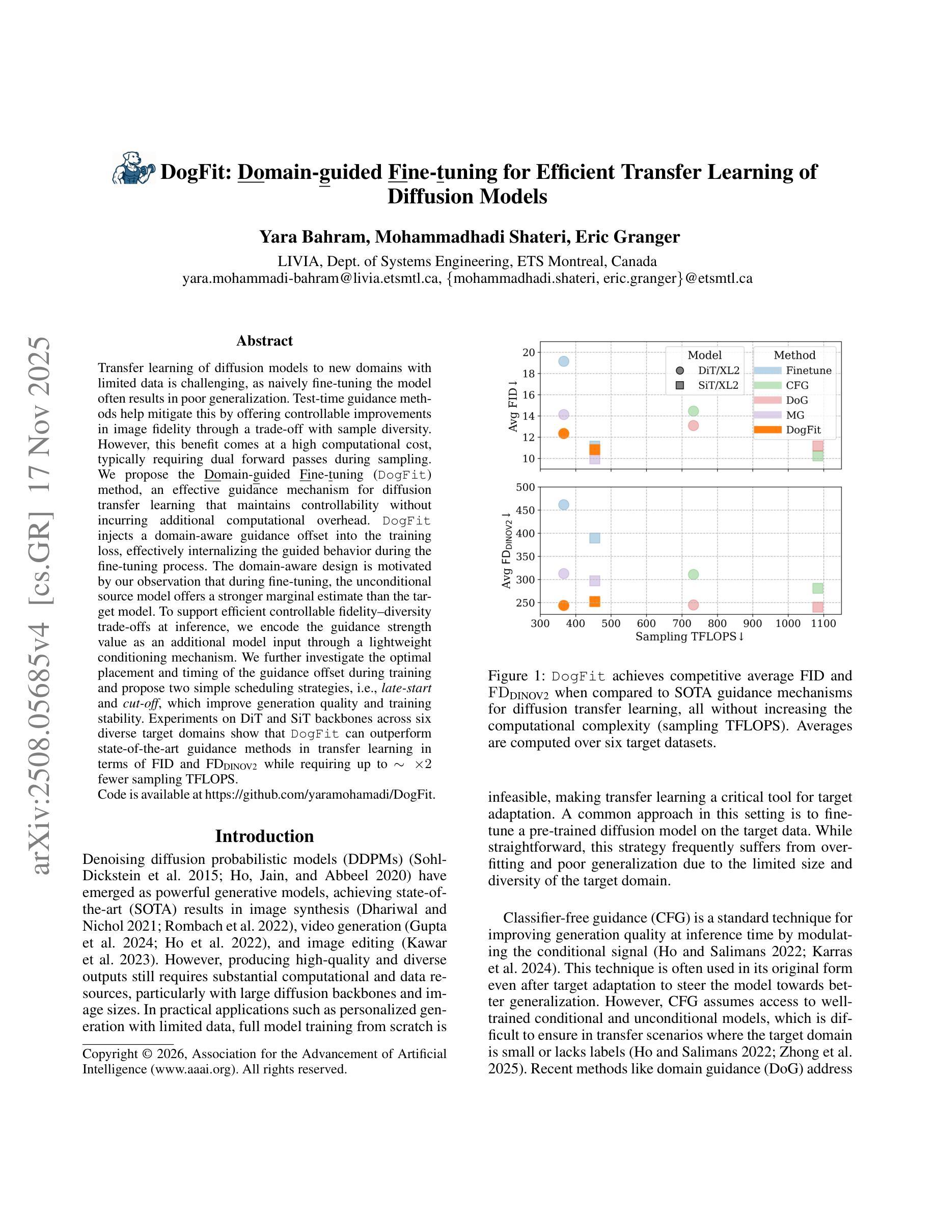 本文探讨了扩散模型在转移到小型目标域时面临的挑战,并介绍了Domain-guided Fine-tuning(DogFit)方法,该方法作为一种有效的指导机制,能够在扩散转移学习中保持可控性,同时不会增加额外的计算开销。DogFit通过注入领域感知指导偏移量来优化训练损失,利用无条件源模型在微调过程中提供更强大的边际估计。在推理过程中,通过轻量级条件机制将指导强度值编码为附加模型输入,以实现可控的保真度与多样性的权衡。此外,本文还探讨了指导偏移在训练过程中的最佳放置和时机,并提出了两种简单的调度策略,即晚期开始和截止策略,以提高生成质量和训练稳定性。实验结果表明,DogFit在六个不同的目标域上优于先前的指导方法,同时减少了采样计算量。