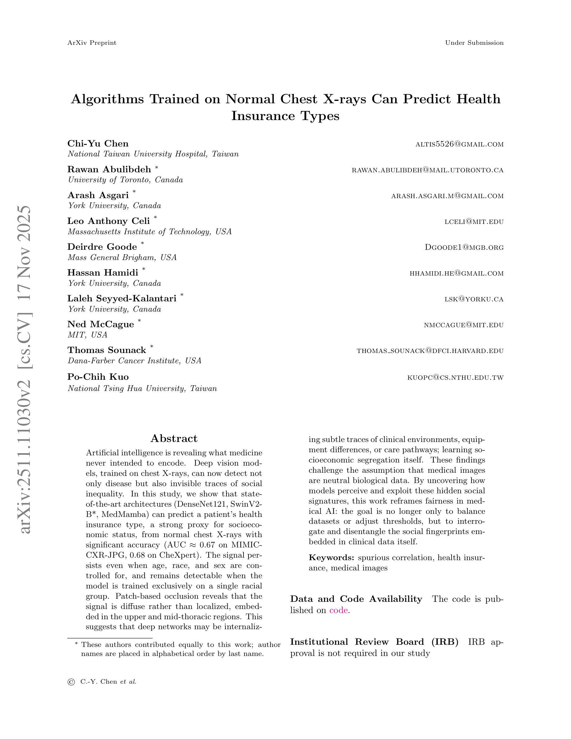 人工智能正在揭示医学从未打算编码的信息。基于胸部X射图像的深度视觉模型现在不仅能够检测疾病,还能发现社会不平等的隐形痕迹。在这项研究中,我们展示了最先进的架构(DenseNet121、SwinV2-B、MedMamba)能从正常的胸部X射图像中准确预测患者的健康保险类型(作为社会经济地位的强烈代理指标),其准确度较高(在MIMIC-CXR-JPG上为AUC约0.67,在CheXpert上为0.68)。即使在控制年龄、种族和性别后,这一信号依然存在,并且在模型仅针对单一种族群体进行训练时仍然可检测。基于补丁的遮挡表明信号是分散的而非局部的,位于上胸部和中胸部区域。这表明深度网络可能正在内化临床环境、设备差异或护理路径的微妙痕迹;学习社会经济分割本身。这些发现挑战了医学图像是中立生物数据的假设。通过揭示模型如何感知和利用这些隐藏的社会签名,这项工作重新定义了医疗人工智能的公平性:目标不再仅仅是平衡数据集或调整阈值,而是质疑和分解嵌入在临床数据中的社会指纹。
