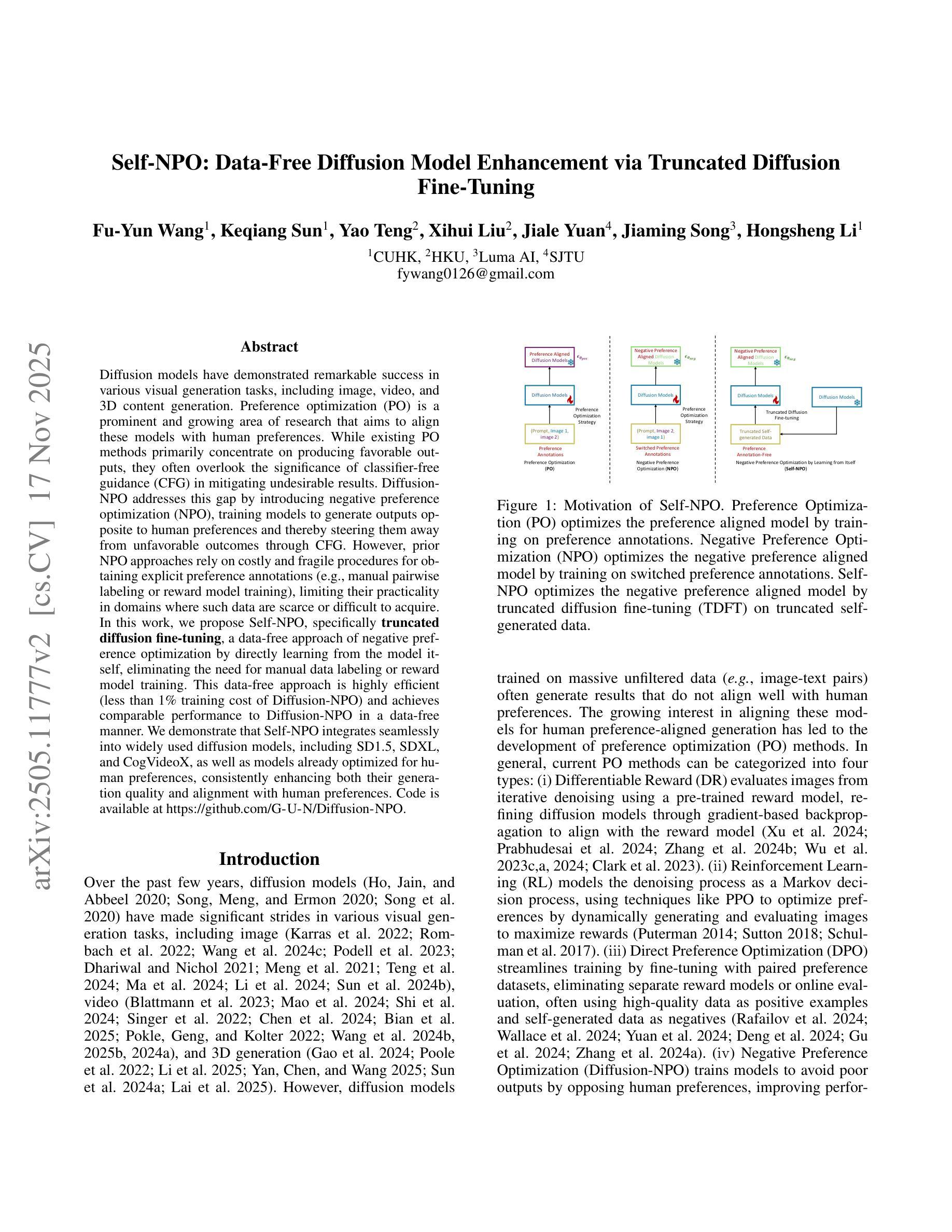 扩散模型在各种视觉生成任务中取得了显著的成功,包括图像、视频和3D内容生成。偏好优化(PO)是一个突出且不断发展的研究领域,旨在将这些模型与人类偏好对齐。虽然现有的PO方法主要集中在产生有利的输出,但它们往往忽视了无分类引导(CFG)在缓解不良结果中的重要作用。Diffusion-NPO通过引入负面偏好优化(NPO)来解决这一差距,训练模型以产生与人类偏好相反的输出来抵制不良结果,并通过CFG引导模型避免这些不利结果。然而,先前的NPO方法依赖于获取显性偏好注释的昂贵且脆弱的过程(例如手动配对标签或奖励模型训练),这在缺乏此类数据或难以获取数据的领域中限制了其实用性。在这项工作中,我们提出了Self-NPO,特别是截断扩散微调,这是一种通过直接从模型本身学习来进行负面偏好优化的无数据方法,无需手动数据标注或奖励模型训练。这种无数据的方法非常高效(仅为Diffusion-NPO的不到1%的训练成本),并且以无数据的方式实现了与Diffusion-NPO相当的性能。我们证明了Self-NPO可以无缝集成到广泛使用的扩散模型中,包括SD1.5、SDXL和CogVideoX,以及已经优化为人类偏好的模型,持续提高它们的生成质量和与人类偏好的对齐程度。代码可在[https://github.com/G-U-N/Diffusion-NPO找到。]