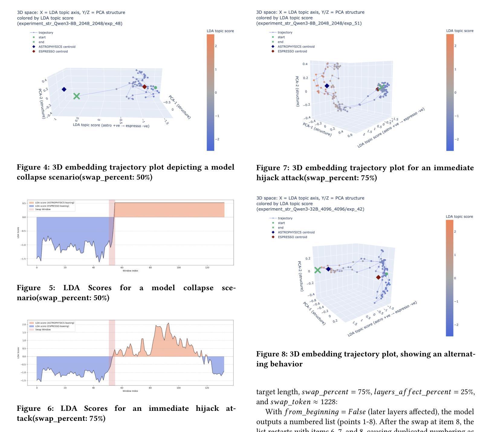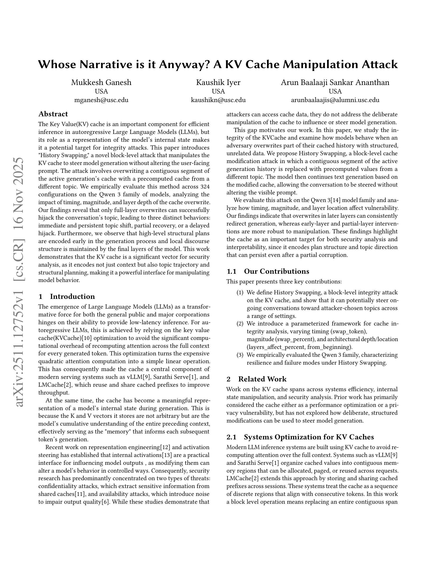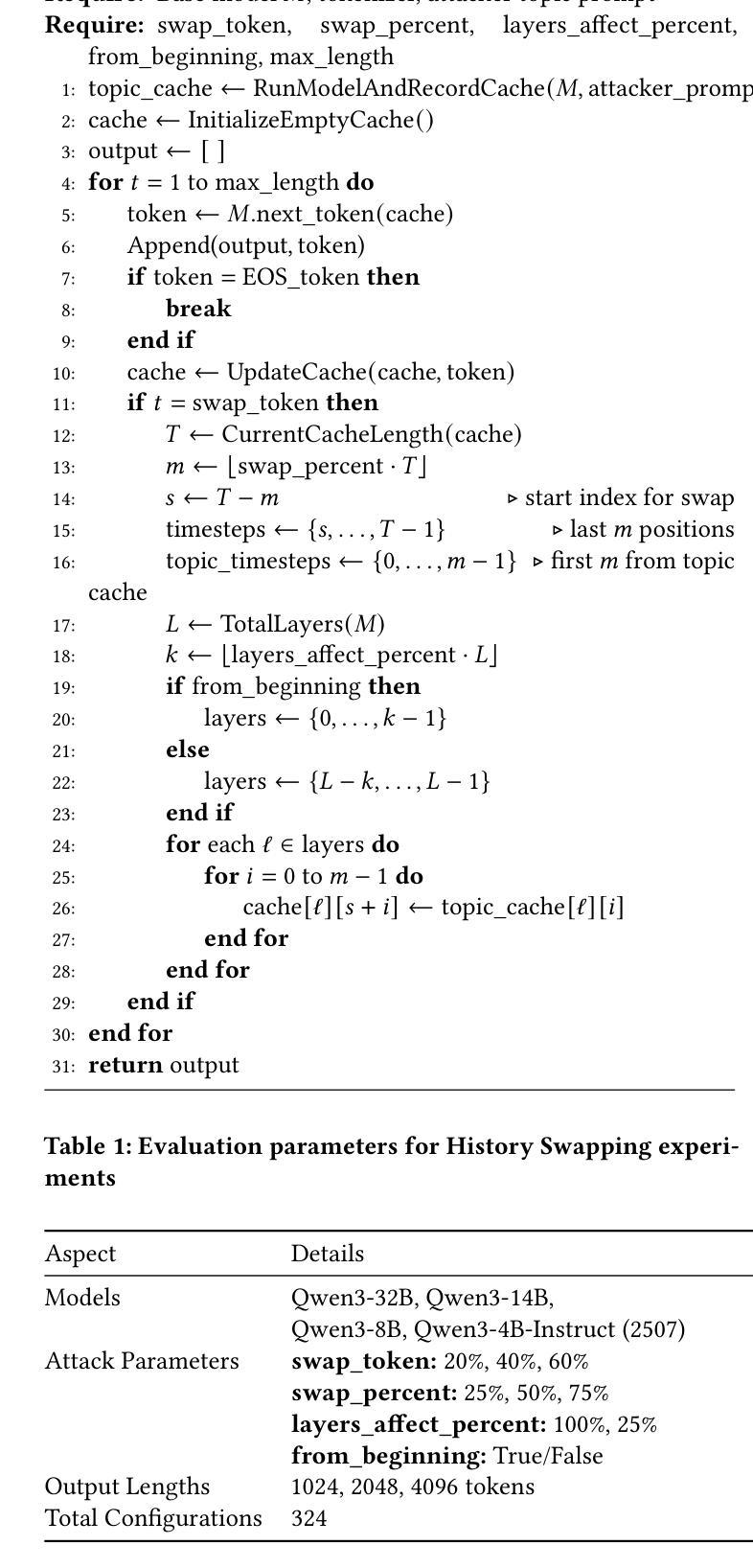 本文探讨了键值(KV)缓存对于大型自回归语言模型(LLM)的推理效率的重要性,同时揭示了其作为模型内部状态表示可能面临的安全风险。针对此问题,文章提出了一种名为“历史交换”的新型块级攻击方法,该方法通过操纵KV缓存来引导模型生成而不改变用户面对的提示。实验评估表明,只有全层覆盖才能成功劫持对话主题,导致三种不同的行为:立即且持久的主题切换、部分恢复或延迟劫持。文章强调KV缓存不仅是上下文编码的重要载体,还包含了话题轨迹和结构规划,因此是操纵模型行为的有力接口。