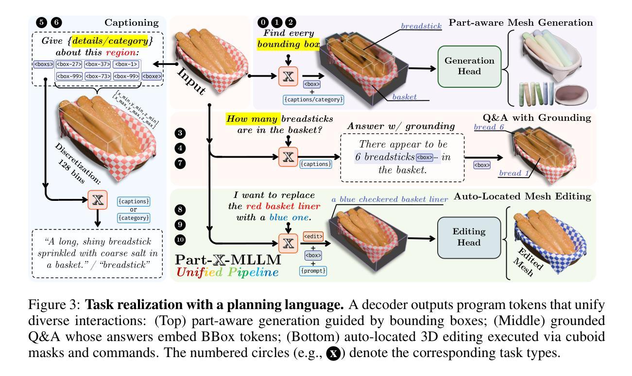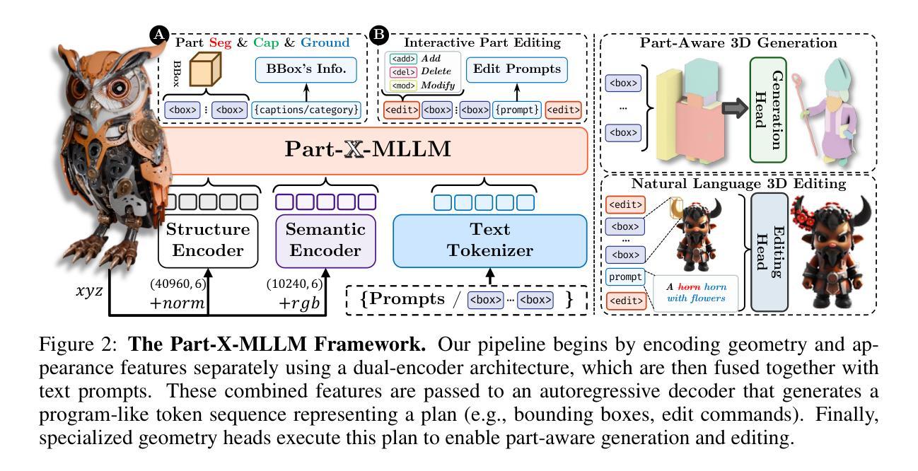 Part-X-MLLM是一种三维多模态大型语言模型,它将各种三维任务统一转化为结构化、可执行的语法程序。通过RGB点云和自然语言提示,模型可生成包含部分级别边界框、语义描述和编辑命令的单一、连贯的令牌序列。这种结构化的输出为基于部分的生成和编辑的下游几何感知模块提供了通用接口。通过符号规划与几何合成的解耦,我们的方法允许任何兼容的几何引擎通过单一的语言原生前端进行控制。模型预训练了一种双编码器架构来分离结构和语义,并在大规模、以部分为中心的数据集上进行指令微调。实验表明,该模型在结构化计划产出方面表现出卓越性能,并通过统一接口实现了领先的地平线问答、组合生成和定位编辑。
