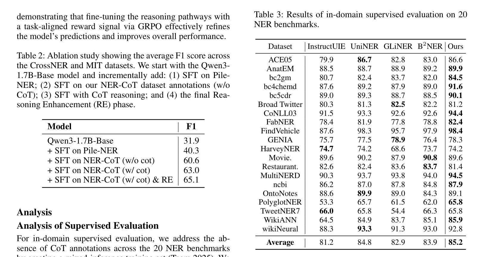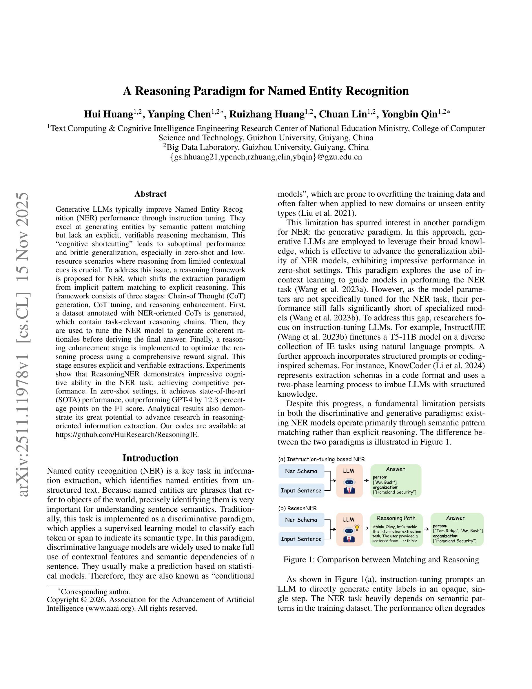 生成式LLM通常通过指令微调提高命名实体识别(NER)性能。它们在通过语义模式匹配生成实体方面表现出色,但缺乏明确可验证的推理机制。这种“认知捷径”导致次优性能和脆弱的泛化能力,特别是在零样本和低资源场景中,从有限的上下文线索中进行推理至关重要。为了解决这一问题,提出了一种用于NER的推理框架,将提取范式从隐式模式匹配转向显式推理。该框架包括三个阶段:思维链(CoT)生成、CoT微调、以及推理增强。首先,生成一个包含面向NER的CoT的数据集,其中包含与任务相关的推理链。然后,它们被用来调整NER模型,在得出最终答案之前生成连贯的理性。最后,实施推理增强阶段,使用全面的奖励信号优化推理过程。这一阶段确保提取是明确且可验证的。实验表明,ReasoningNER在NER任务中展现出令人印象深刻的认知能力,取得了具有竞争力的性能。在零样本设置中,它在F1分数上超越了GPT-4,达到了业界领先(SOTA)的性能水平,高出12.3个百分点。分析结果表明,它在推动以推理为核心的信息提取研究方面具有巨大潜力。我们的代码可在https://github.com/HuiResearch/ReasoningIE获取。