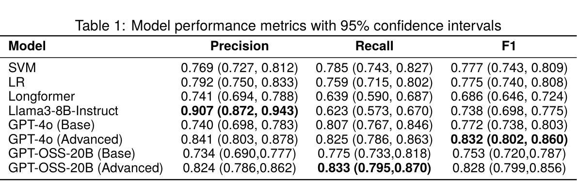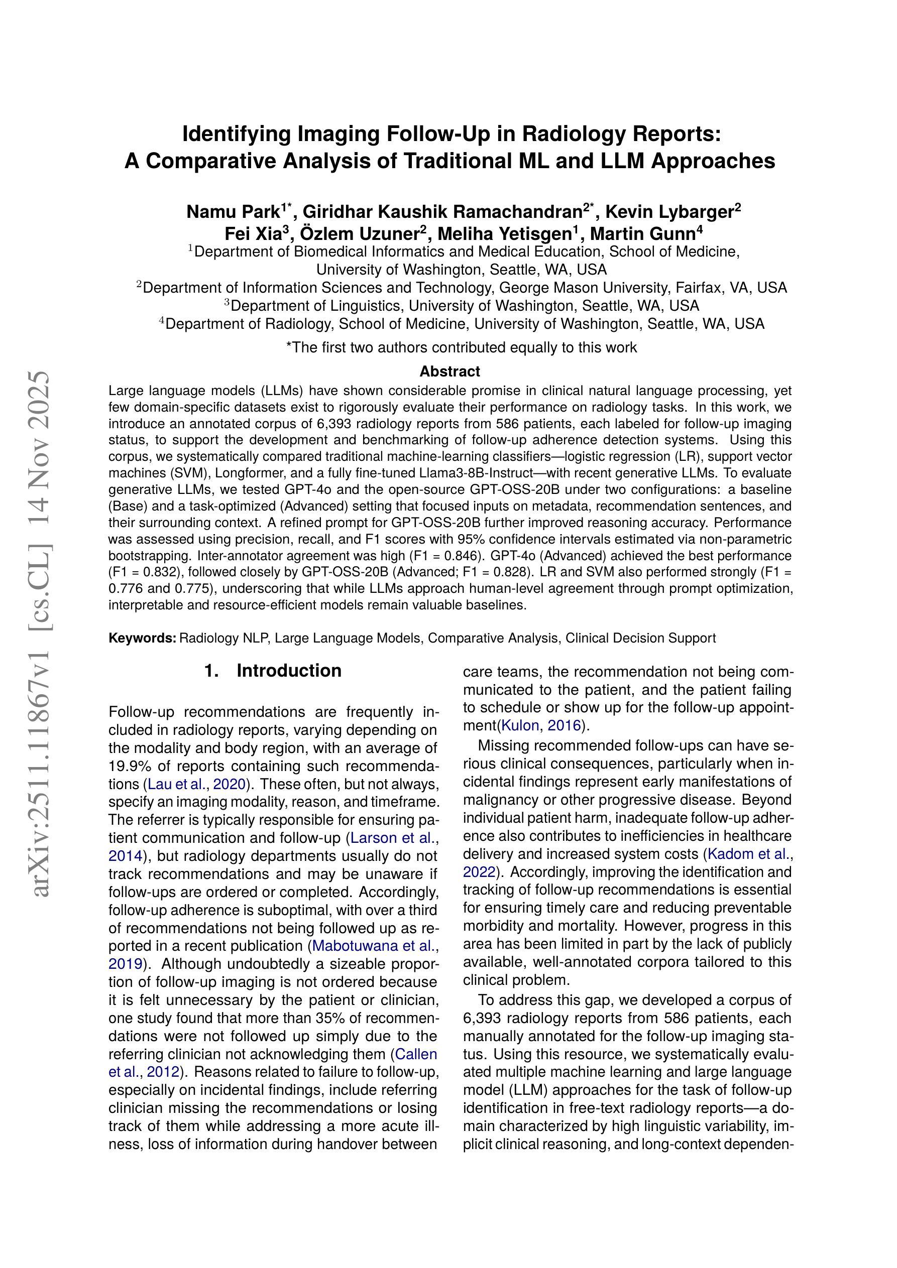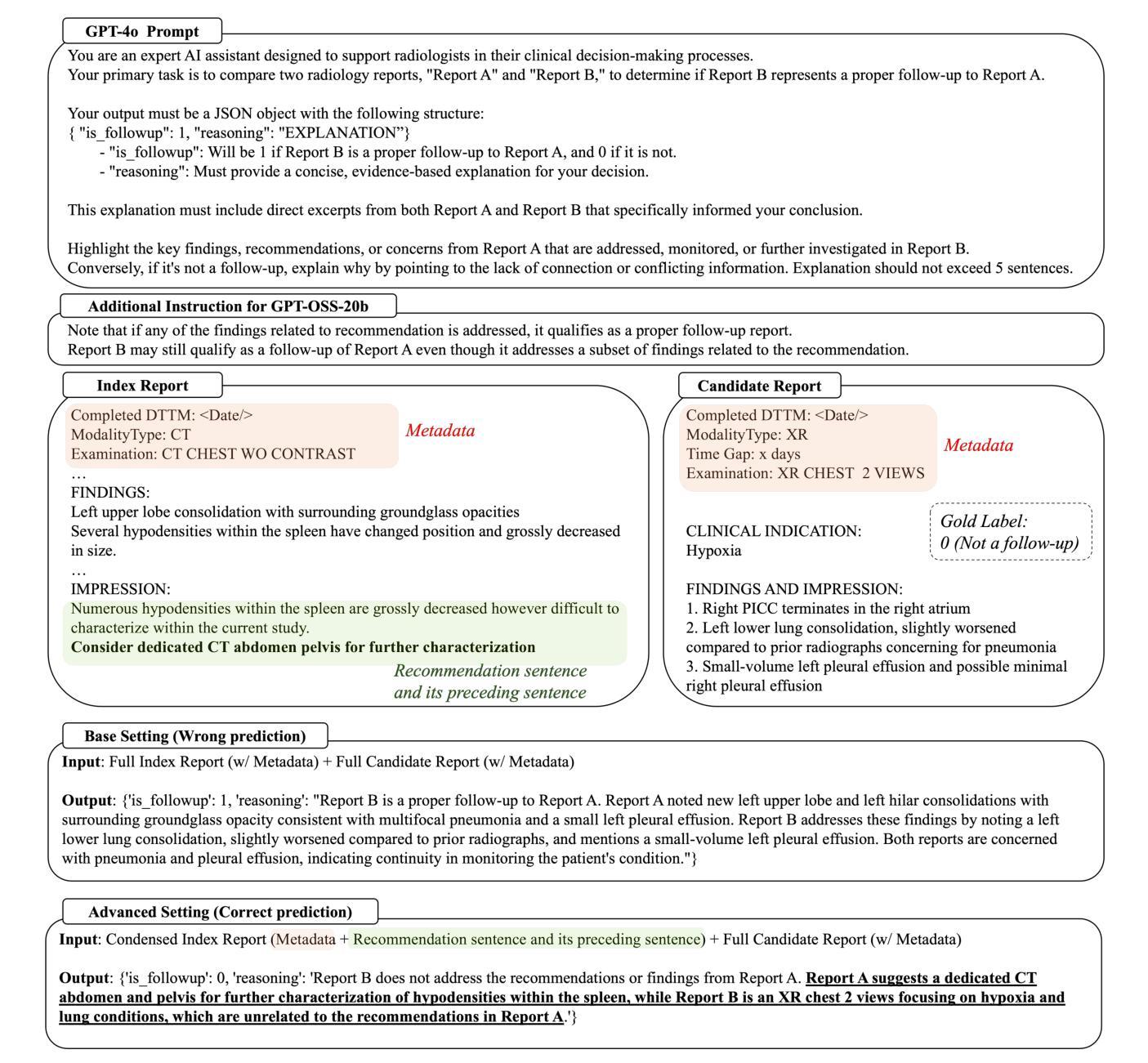 大型语言模型(LLM)在临床自然语言处理中显示出巨大的潜力,但在放射学任务上严格评估其性能的专业数据集却很少。在这项工作中,我们引入了来自586名患者的6393份放射学报告数据集,每份报告都标有随访影像状态,以支持开发并评估随访依从性检测系统。使用此数据集,我们系统地比较了传统的机器学习分类器,包括逻辑回归(LR)、支持向量机(SVM)、Longformer和完全微调过的Llama3-8B-Instruct,以及与近期的生成式LLM。为了评估生成式LLM,我们测试了GPT-4o和开源GPT-OSS-20B在两种配置下的表现:一种是基础(Base)设置,另一种是专注于元数据的任务优化(Advanced)设置,以及推荐句子及其周围上下文。GPT-OSS-20B的精细提示进一步提高了推理准确性。通过非参数化bootstrap方法来评估性能,使用精确度、召回率和F1分数,并估计95%置信区间。注释者间协议率高(F1=0.846)。GPT-4o(Advanced)表现最佳(F1=0.832),紧随其后的是GPT-OSS-20B(Advanced;F1=0.828)。LR和SVM也表现出色(F1=0.776和0.775),这表明虽然通过提示优化LLM可以接近人类水平的协议,但可解释性和资源高效的模型仍然是宝贵的基准。