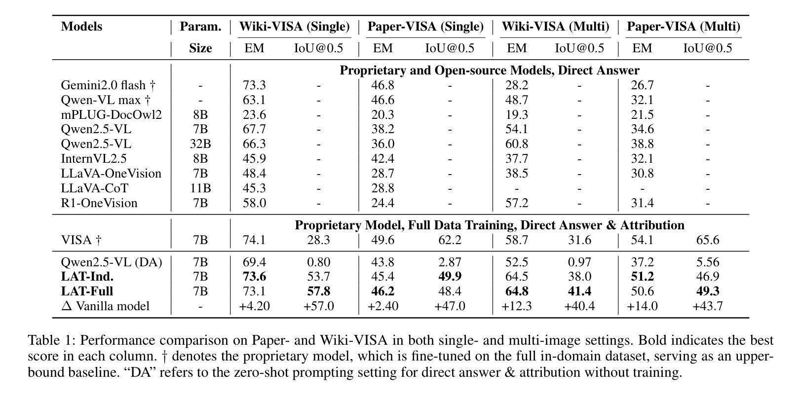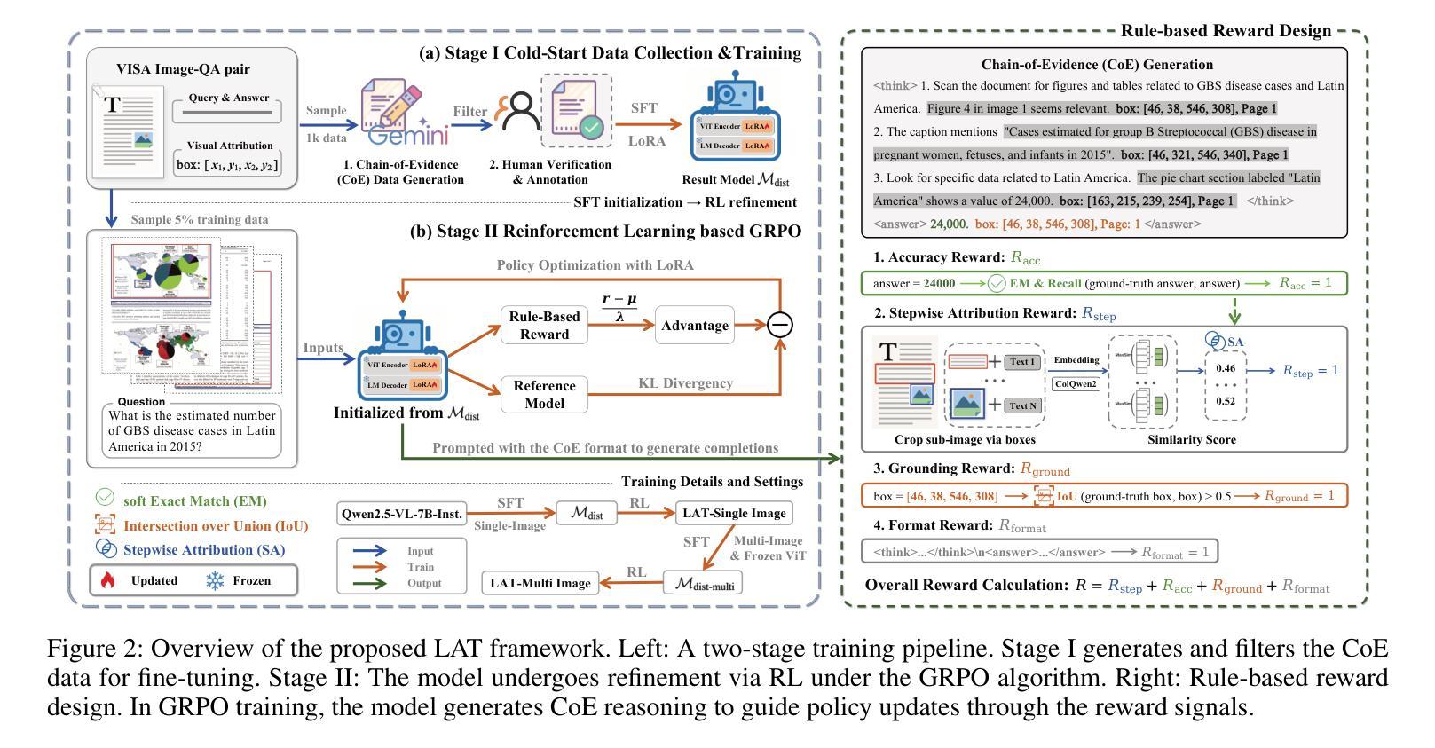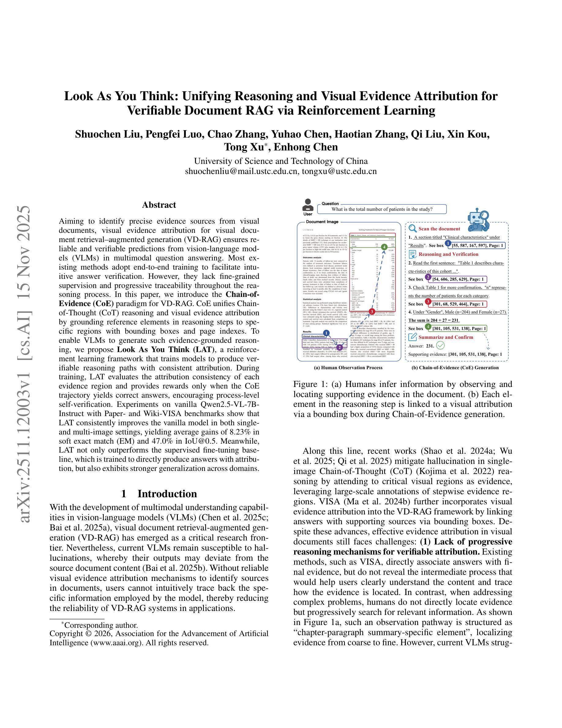 针对从视觉文档中提取精确证据源的目标,视觉证据归属对于视觉文档检索增强生成(VD-RAG)至关重要,以确保多模态问答中的视觉语言模型(VLMs)提供可靠和可验证的预测。现有的大多数方法采用端到端的训练方式,以便于直观的答案验证。然而,它们在整个推理过程中缺乏精细的监督和逐步的可追溯性。在本文中,我们为VD-RAG引入了证据链(CoE)范式。CoE通过结合思维链(CoT)推理和视觉证据归属,通过将参考元素与带有边界框和页面索引的特定区域相关联,实现了统一。为了允许VLMs生成这种以证据为基础的理由,我们提出了“边思考边观察”(LAT)这一强化学习框架,该框架训练模型以产生具有一致归属性的可验证推理路径。在训练过程中,LAT评估每个证据区域的归属一致性,并且仅在证据链轨迹产生正确答案时才提供奖励,鼓励进行过程级别的自我验证。在采用Paper-和Wiki-VISA基准测试的普通Qwen2.5-VL-7B-Instruct上进行的实验表明,LAT在单图像和多图像设置中均持续提高了基础模型的性能,在软精确匹配(EM)方面平均提高了8.23%,在IoU@0.5方面提高了47.0%。与此同时,LAT不仅优于通过监督微调基线(训练为直接产生带有归属性的答案),而且在跨域方面的泛化性能更强。