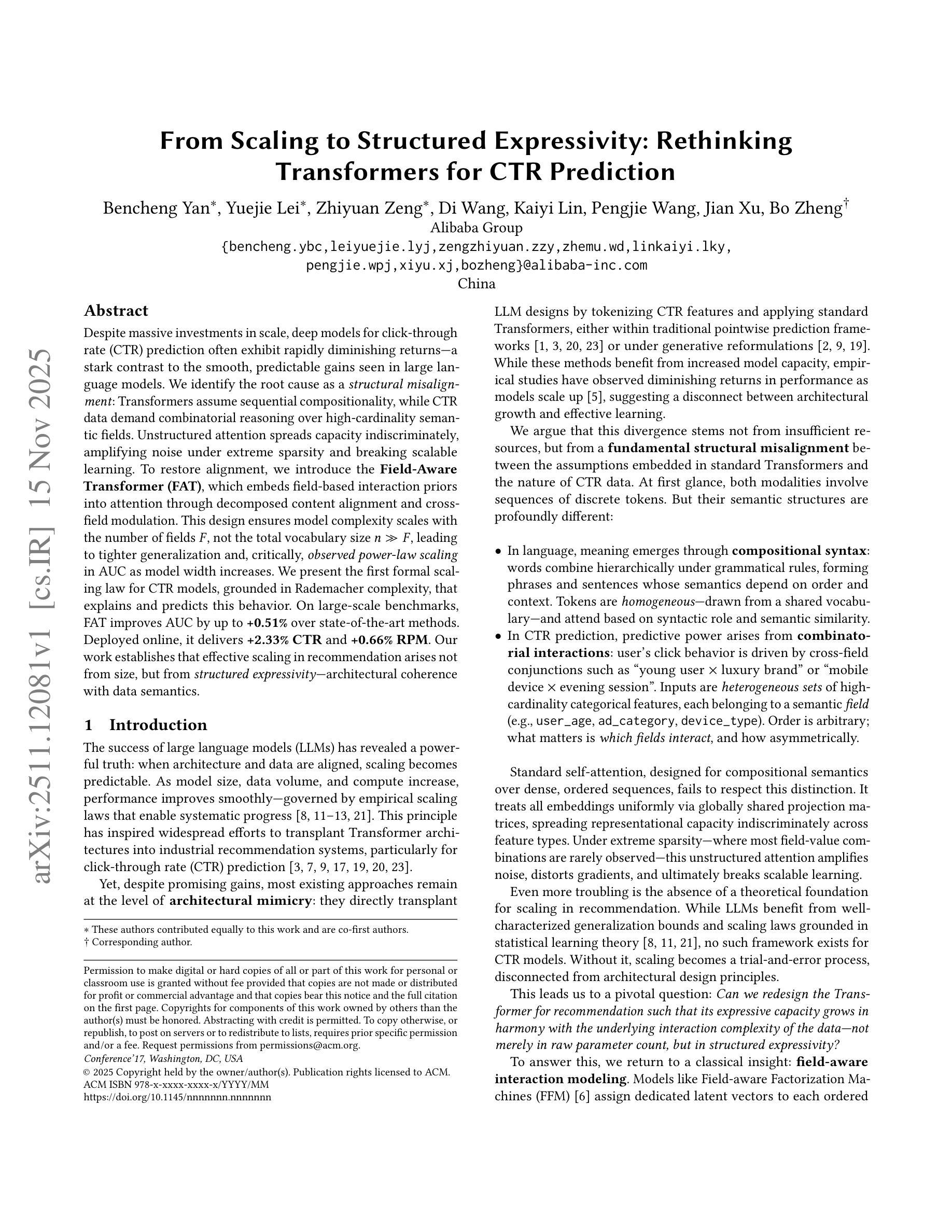尽管在规模上投入了大量资金,但用于点击率(CTR)预测的深层模型往往表现出收益迅速递减的趋势,这与大型语言模型中看到的平稳、可预测的收益形成了鲜明对比。我们确定根本原因是结构不匹配:Transformer 假设了顺序组合性,而 CTR 数据则需要在高基数语义字段上进行组合推理。非结构化的注意力会漫无目的地分散能力,在极端稀疏性下放大噪音并破坏可扩展学习。为了恢复对齐,我们引入了基于字段的 Transformer(FAT),它通过分解内容对齐和跨字段调制,将字段交互先验知识嵌入到注意力中。这种设计确保了模型复杂度随着字段数 F 的增加而扩展,而不是随着总词汇量 n >> F 的增加而增加,从而实现了更紧密的泛化,并且在模型宽度增加时观察到 AUC 中的幂律扩展至关重要。我们提出了基于 Rademacher 复杂性的 CTR 模型的首个正式扩展定律,该定律解释并预测了这一行为。在大型基准测试中,与最新方法相比,FAT 的 AUC 提高了高达 +0.51%。在线部署时,它提高了 2.33% 的点击率和 0.66% 的 RPM。我们的工作确定了有效的推荐扩展并非来自规模,而是来自结构化表达能力与数据语义的结构一致性。