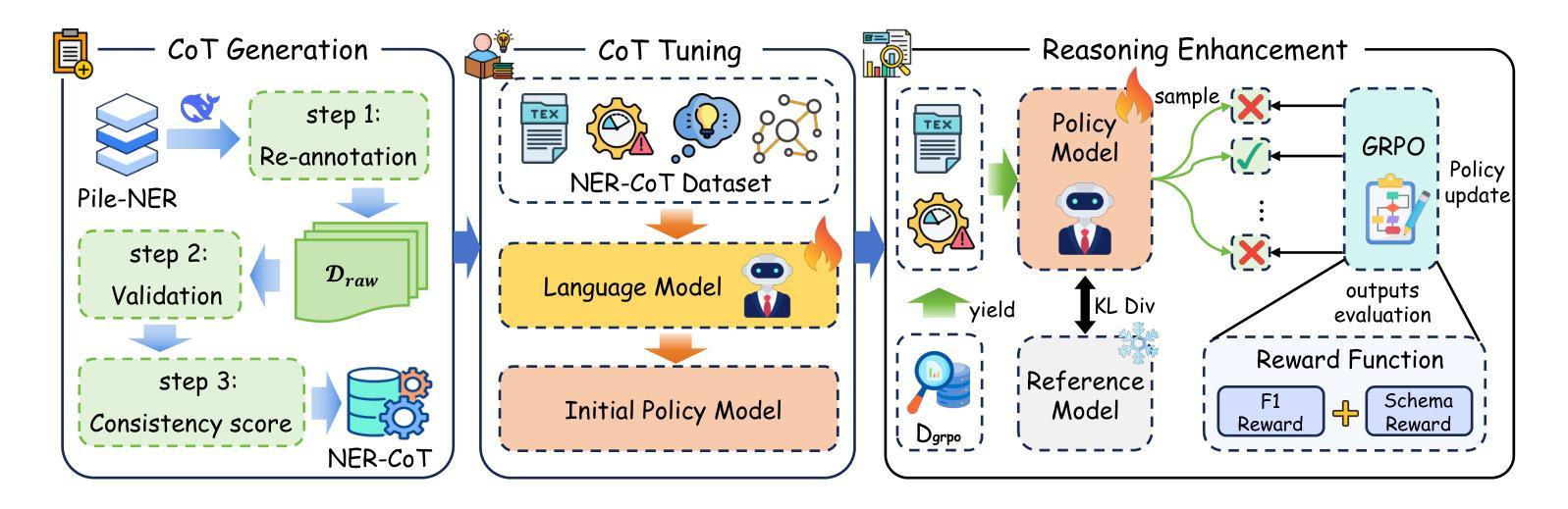 - 提出了一个用于NER的推理框架,包括思维链生成、思维链微调、推理增强三个阶段。