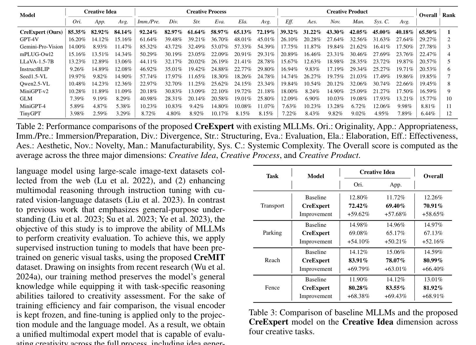 - 基于CreBench微调了开源的通用MLLMs,得到多模态创造力评估专家模型CrExpert。