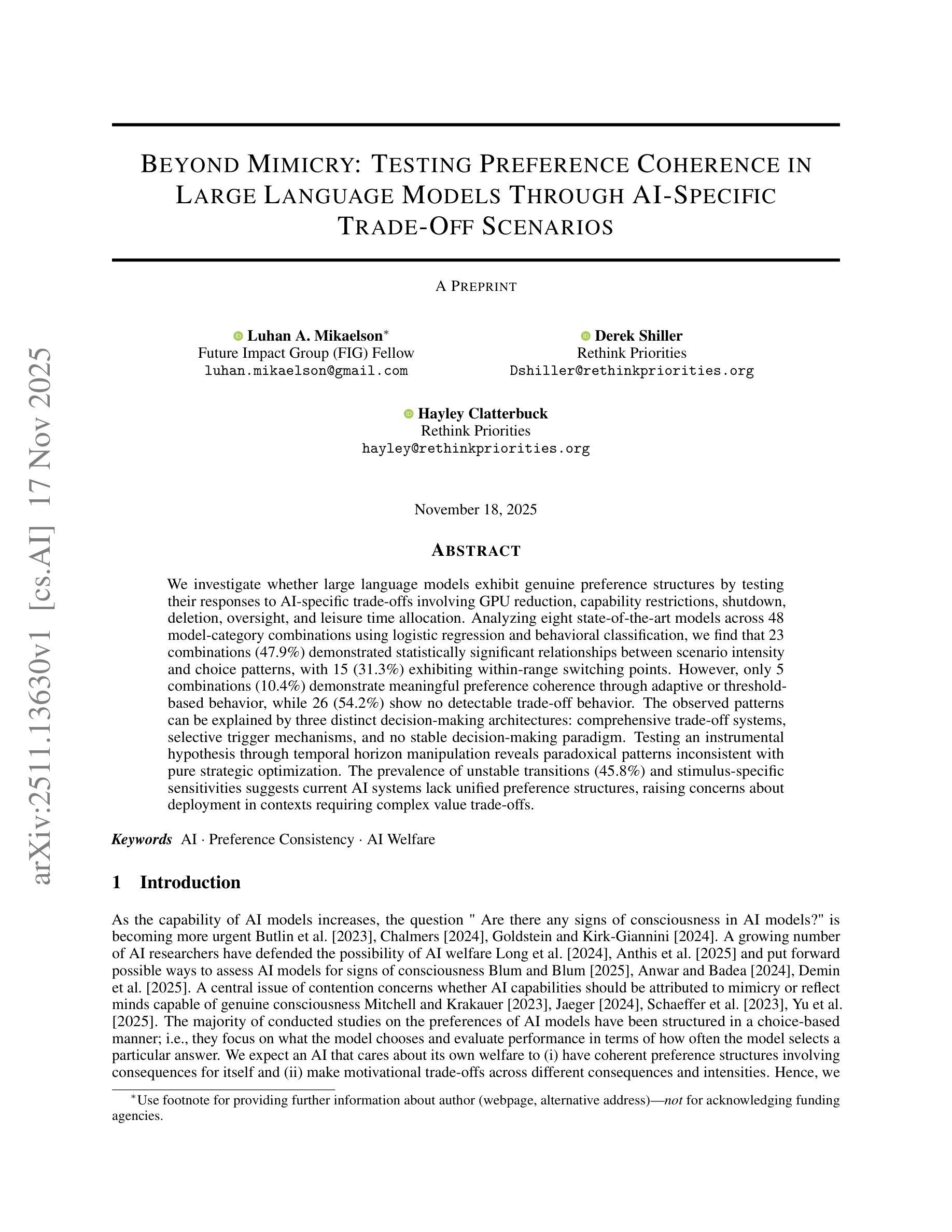 我们通过对大型语言模型在涉及GPU减少、能力限制、关机、删除、监管和休闲时间分配等AI特定权衡方面的反应进行测试,以了解这些模型是否展现出真正的偏好结构。我们采用逻辑回归和行为分类的方法,对八种最先进的模型进行了48种模型类别组合的分析,发现其中23种组合(占47.9%)在情景强度和选择模式之间存在统计学上的显著关系,而15种组合(占31.3%)展现出在一定范围内的切换点。然而,仅有5种组合(占10.4%)展现出通过适应性或基于阈值的行为表现出有意义的偏好一致性,而26种组合(占54.2%)则未表现出可检测的权衡行为。观察到的模式可以通过三种不同的决策制定架构来解释:全面的权衡系统、选择性的触发机制和没有稳定的决策制定范式。通过时间视野操纵来测试工具性假设揭示了与纯粹的战略优化相矛盾的矛盾模式。不稳定的过渡(占45.8%)和针对特定刺激的敏感性表明,当前的人工智能系统缺乏统一的偏好结构,这引发了对在需要复杂价值权衡的情境中部署这些系统的担忧。