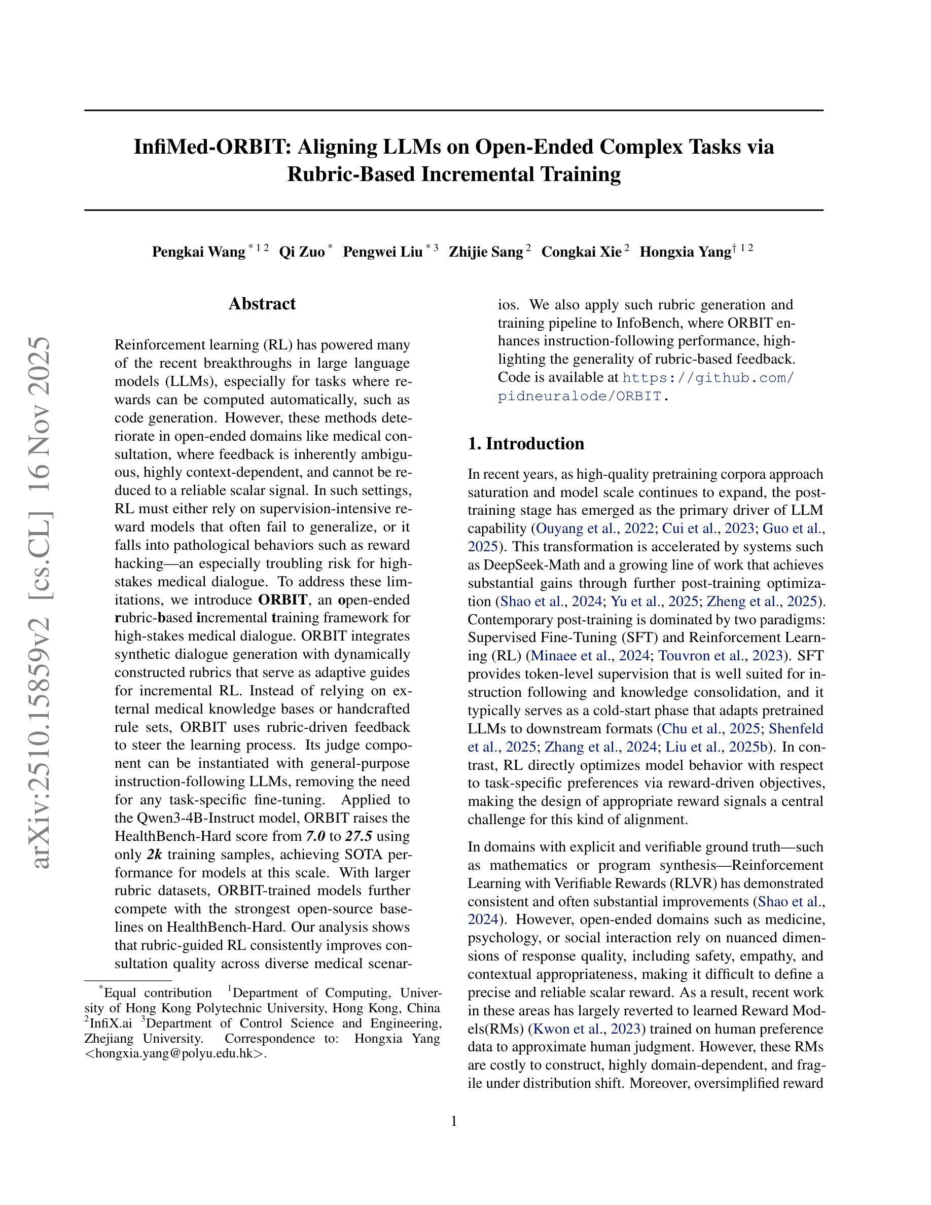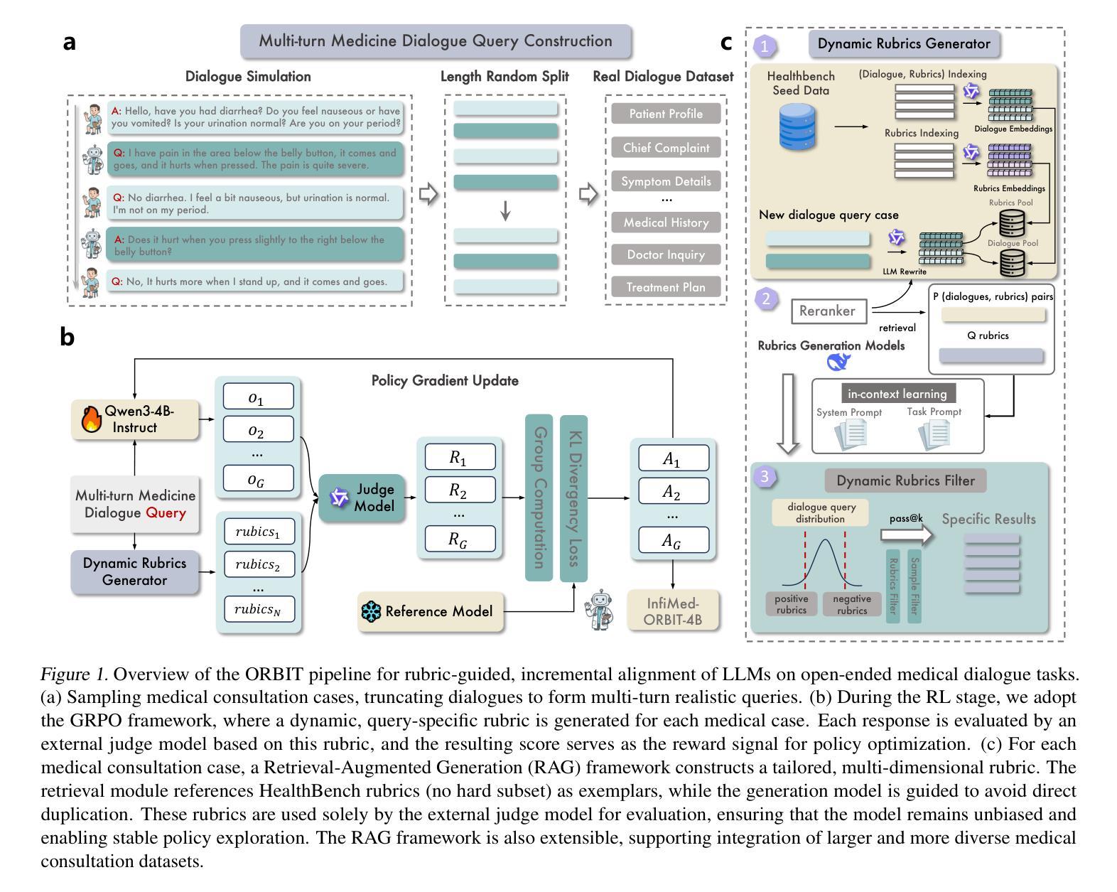 强化学习在大型语言模型中,特别是在可以自动计算奖励的任务中,如代码生成,取得了许多突破。然而,在开放领域如医疗咨询中,反馈具有固有的模糊性、高度依赖于上下文,并且不能简化为可靠的标量信号,这些方法的效果会下降。在这种情况下,强化学习必须依赖监督密集的奖励模型,通常无法概括,或者陷入病理行为,如奖励破解,这对高风险的医疗对话特别令人担忧。为解决这些局限性,我们推出了ORBIT,一个用于高风险医疗对话的开放规则增量训练框架。ORBIT集成了合成对话生成与动态构建的规则,作为增量强化学习的自适应指南。它不需要依赖外部医学知识库或手工规则集,而是使用规则驱动的反馈来引导学习过程。其法官组件可以使用通用指令跟随大型语言模型进行实例化,无需任何特定任务的微调。在Qwen3-4B-Instruct模型的应用中,ORBIT将HealthBench-Hard得分从7.0提高到27.5,仅使用2k训练样本,在模型规模上取得了最新性能。使用更大的规则数据集,ORBIT训练的模型进一步在HealthBench-Hard上与最强大的开源基线竞争。我们的分析表明,规则指导的强化学习在多种医学场景中始终提高了咨询质量。我们还将这种规则生成和培训管道应用于InfoBench,其中ORBIT增强了指令跟随性能,突出了规则反馈的普遍性。