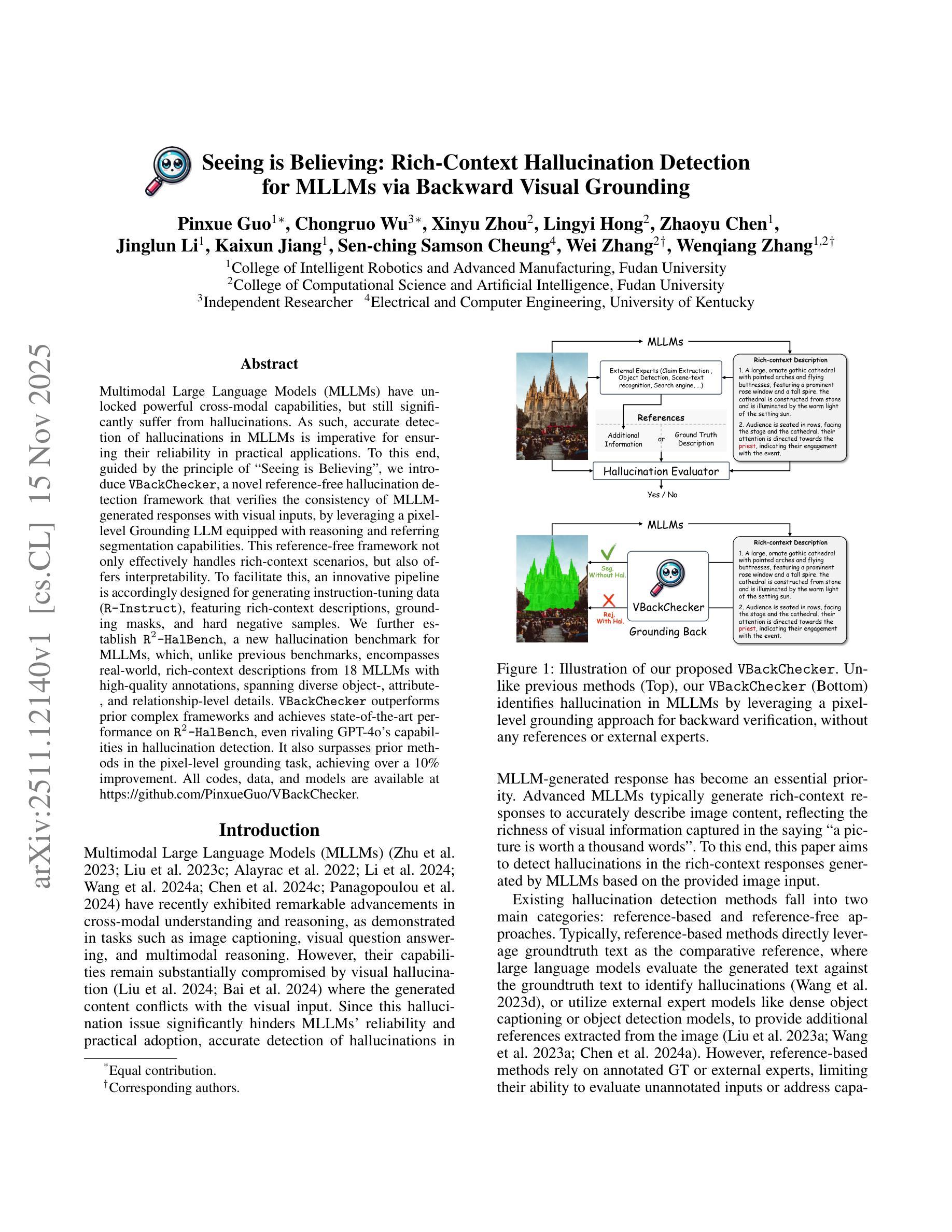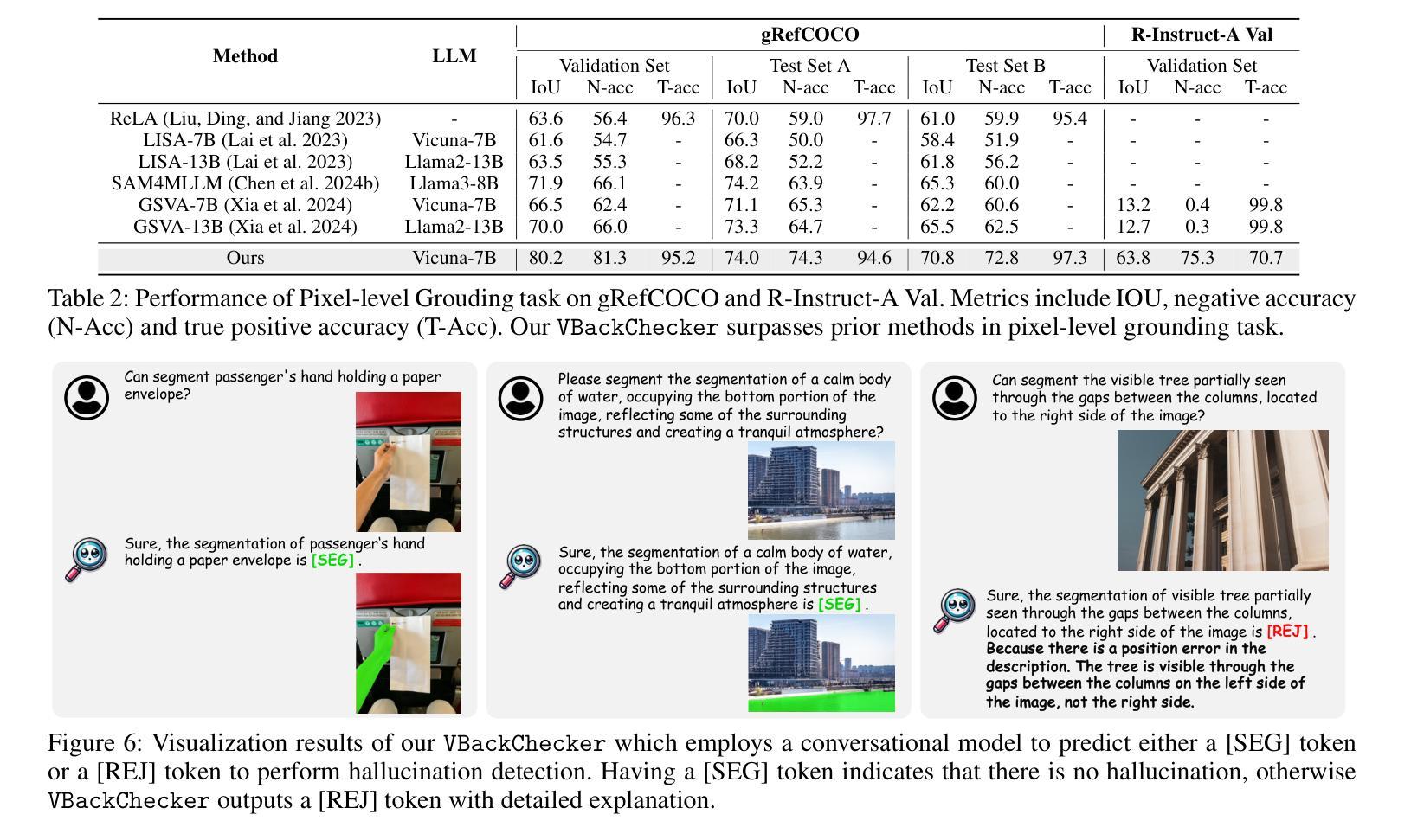 Multimodal Large Language Models (MLLMs) have unlocked powerful cross-modal capabilities, but still significantly suffer from hallucinations. As such, accurate detection of hallucinations in MLLMs is imperative for ensuring their reliability in practical applications. To this end, guided by the principle of “Seeing is Believing”, we introduce VBackChecker, a novel reference-free hallucination detection framework that verifies the consistency of MLLMgenerated responses with visual inputs, by leveraging a pixellevel Grounding LLM equipped with reasoning and referring segmentation capabilities. This reference-free framework not only effectively handles rich-context scenarios, but also offers interpretability. To facilitate this, an innovative pipeline is accordingly designed for generating instruction-tuning data (R-Instruct), featuring rich-context descriptions, grounding masks, and hard negative samples. We further establish R^2 -HalBench, a new hallucination benchmark for MLLMs, which, unlike previous benchmarks, encompasses real-world, rich-context descriptions from 18 MLLMs with high-quality annotations, spanning diverse object-, attribute, and relationship-level details. VBackChecker outperforms prior complex frameworks and achieves state-of-the-art performance on R^2 -HalBench, even rivaling GPT-4o’s capabilities in hallucination detection. It also surpasses prior methods in the pixel-level grounding task, achieving over a 10% improvement. All codes, data, and models are available at https://github.com/PinxueGuo/VBackChecker.