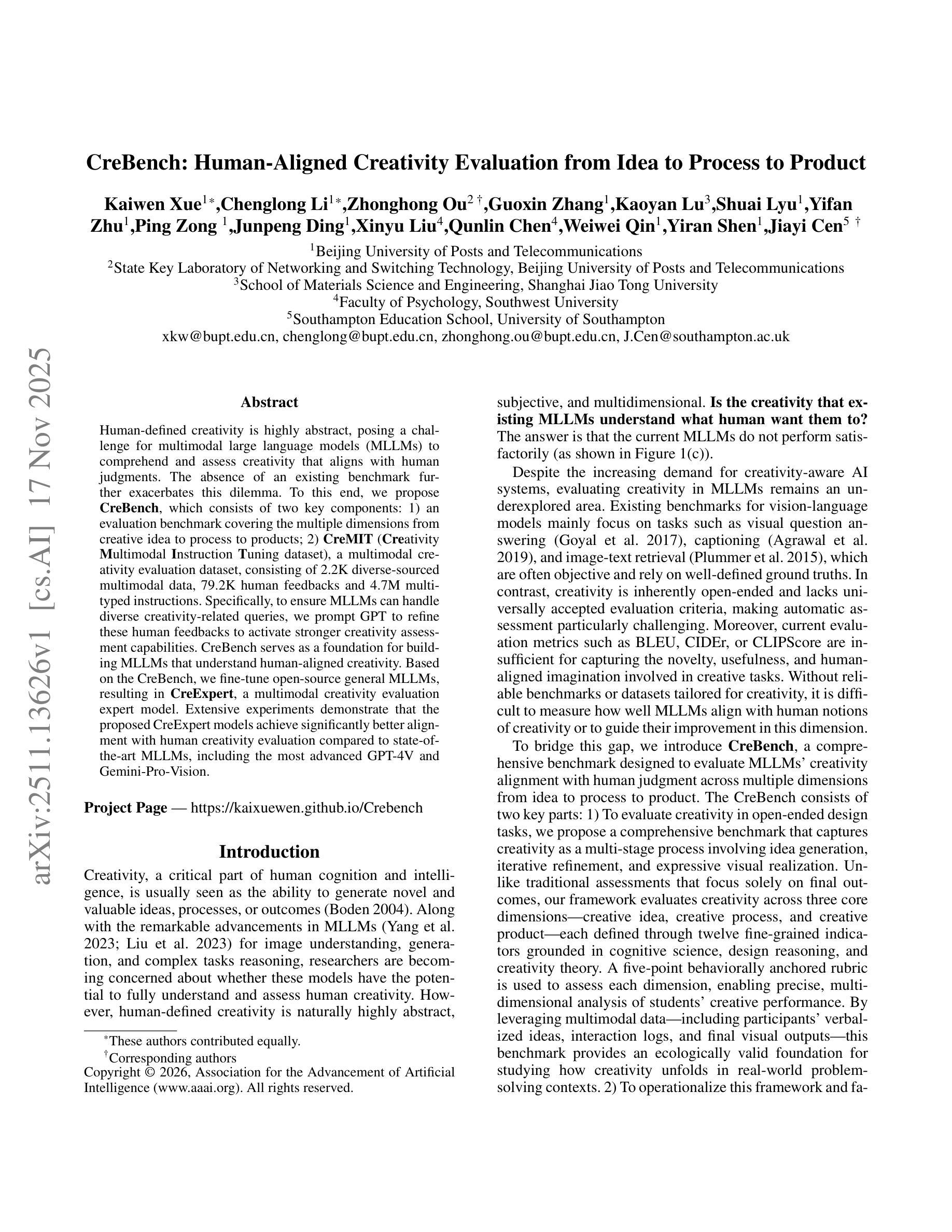人类定义的创造力具有高度的抽象性,为多模态大型语言模型(MLLMs)理解和评估与人类判断相符的创造力带来了挑战。为解决此问题,我们提出了包含两个关键组成部分的CreBench:一是对创意想法、过程和产品等多个维度的评估基准;二是包含2.2K多种来源的多模态数据、79.2K人类反馈和470万条多类型指令的创造力多模态指令微调数据集(CreMIT)。我们通过提示GPT细化人类反馈,确保MLLMs能够处理各种与创造力相关的查询,从而激活更强的创造力评估能力。基于CreBench,我们微调了开源的通用MLLMs,得到了多模态创造力评估专家模型CreExpert。实验表明,与最新的MLLMs相比,包括最先进的GPT-4V和Gemini-Pro-Vision等模型在内,CrExpert模型的创造力评估与人类创造力评价的契合度更高。