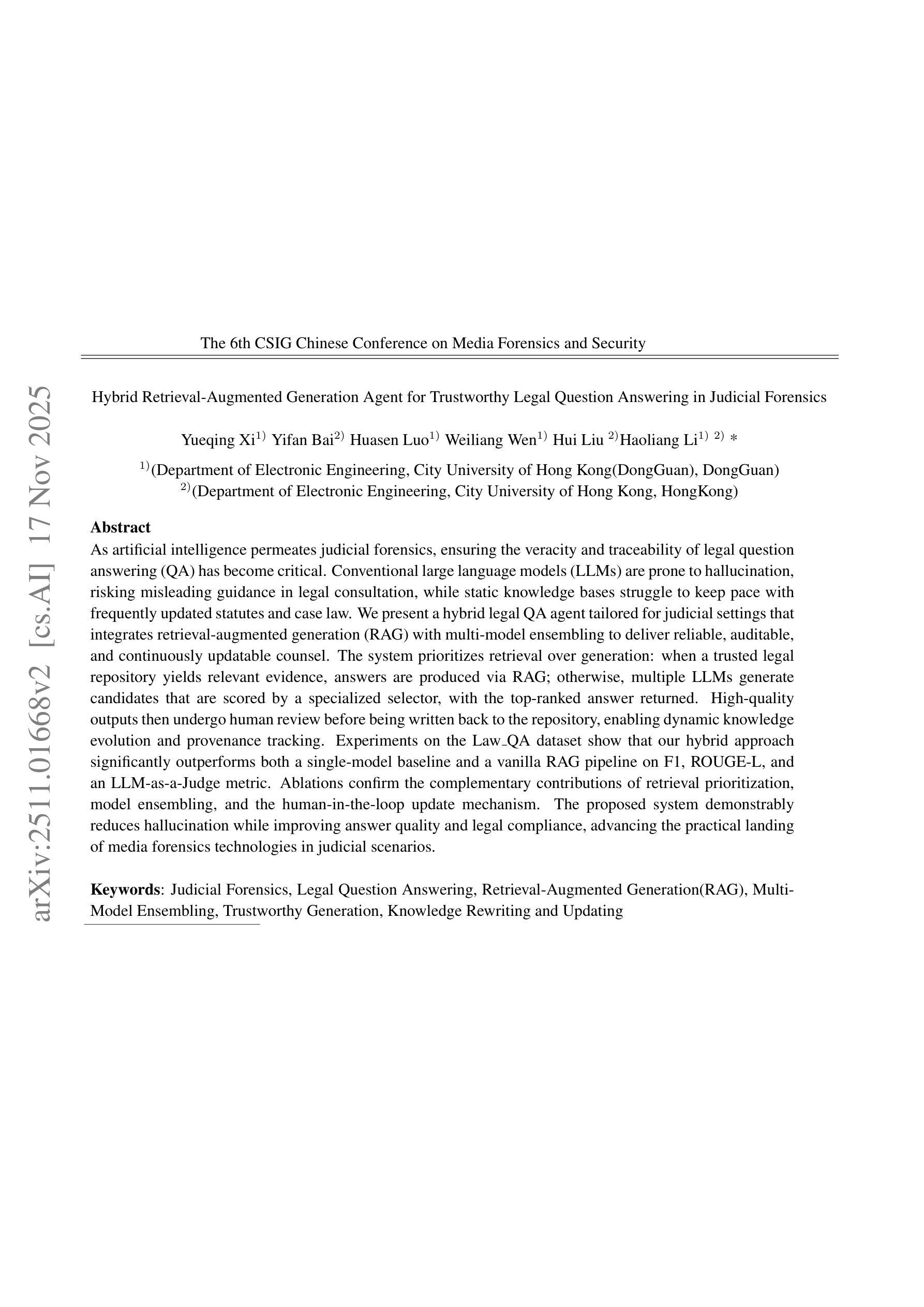 随着人工智能在司法鉴定中的普及,确保法律问答(QA)的真实性和可追溯性变得至关重要。传统的大型语言模型(LLM)容易出现幻觉,可能导致法律咨询时产生误导性指导,而静态的知识库难以跟上频繁更新的法律和判例。我们针对司法环境量身定制了一种混合法律问答代理,它将检索增强生成(RAG)与多模型集成相结合,以提供可靠、可审核和持续更新的咨询。该系统优先检索生成:当可信赖的法律存储库产生相关证据时,答案将通过RAG产生;否则,多个LLM生成候选答案,并由专用选择器进行评分,返回排名最高的答案。高质量输出然后经过人工审核后写回到存储库,实现动态知识演变和来源跟踪。在法律QA数据集上的实验表明,我们的混合方法在信息精度、ROUGE-L和LLM作为法官的度量标准上显著优于单模型基准和简单的RAG管道。消融实验证实了检索优先、模型集成和人工循环更新机制的互补作用。所提出的系统显著减少了幻觉,提高了答案质量和法律合规性,促进了媒体取证技术在司法场景中的实际应用落地。