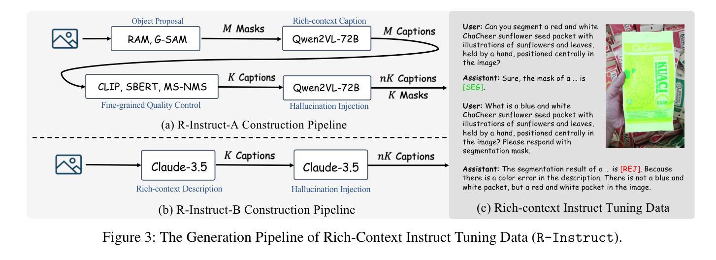 - 设计了生成指令调整数据(R-Instruct)的创新管道,用于丰富语境描述、接地掩码和硬负样本。