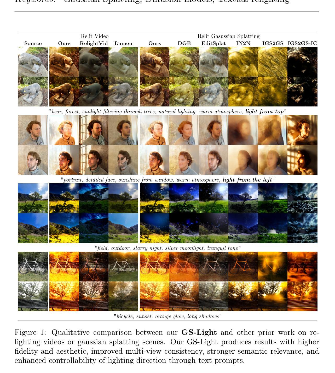 本文介绍了GS-Light,这是一种高效的、对文本位置敏感的管道,用于对通过高斯拼贴(3DGS)表示的3D场景进行文本引导的重照明。GS-Light实施了一种无需训练的多视图输入扩散模型扩展,给定用户提示(可能指定照明方向、颜色、强度或参考对象),采用大型视觉语言模型(LVLM)将提示解析为照明先验。结合现成的几何和语义估计器(深度、表面法线和语义分割),将照明先验与视图几何约束融合,计算照明图并为每个视图生成初始潜在代码。这些精心得出的初始潜在代码指导扩散模型生成更准确地反映用户期望的照明输出,特别是在照明方向方面。通过向多视图重照明模型输入多视图渲染图像以及初始潜在代码,生成高保真、艺术化的重照明图像。最后,使用重照明外观微调3DGS场景,获得完全重照明的3D场景。GS-Light在室内外场景上的评估表明,与最先进的基线相比,它在多视图一致性、成像质量、美学评分、语义相似性等方面表现出持续的改进。