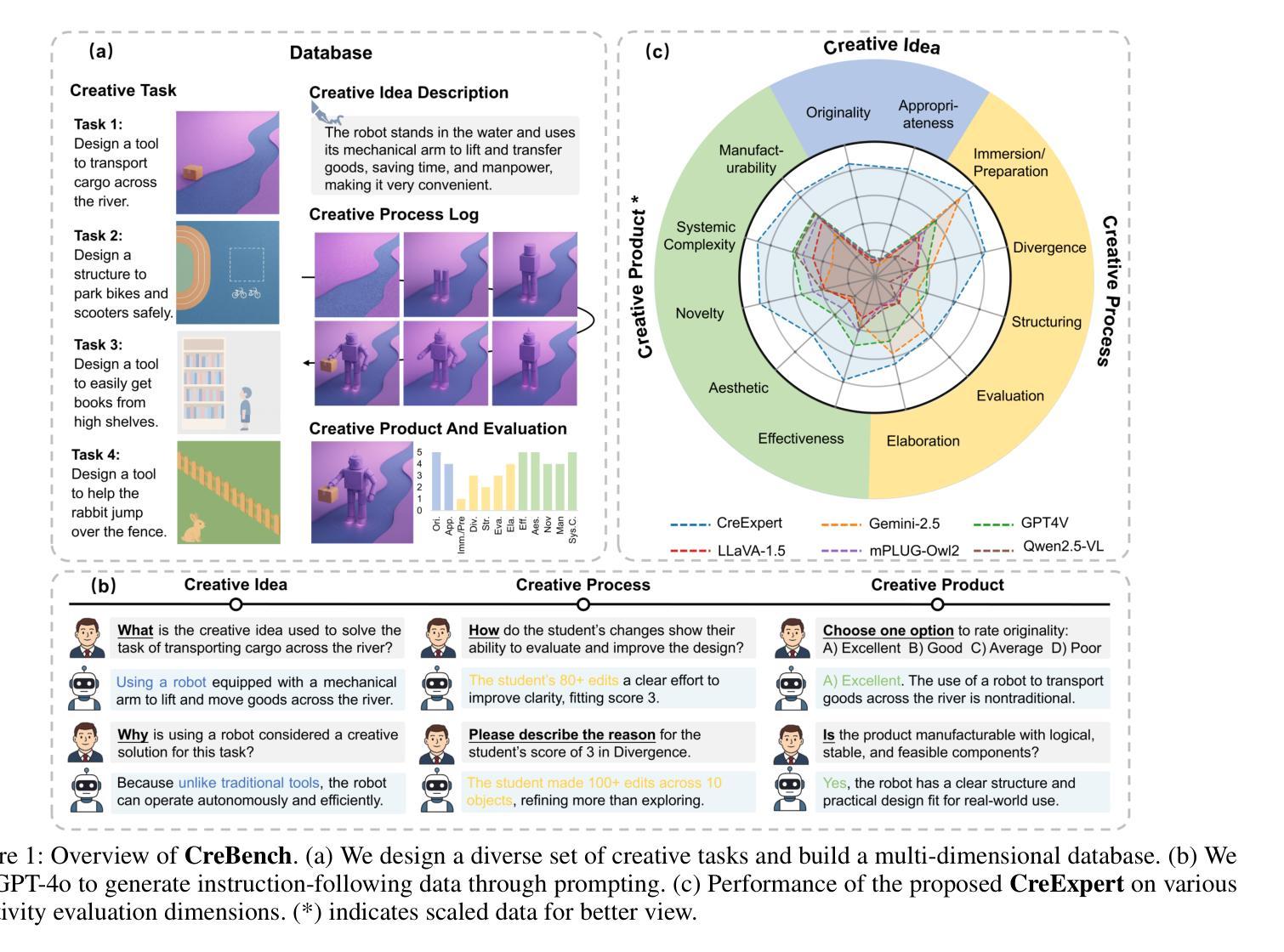 - 提出CreBench以解决此问题,包含评估基准和多模态创造力评价数据集CreMIT。