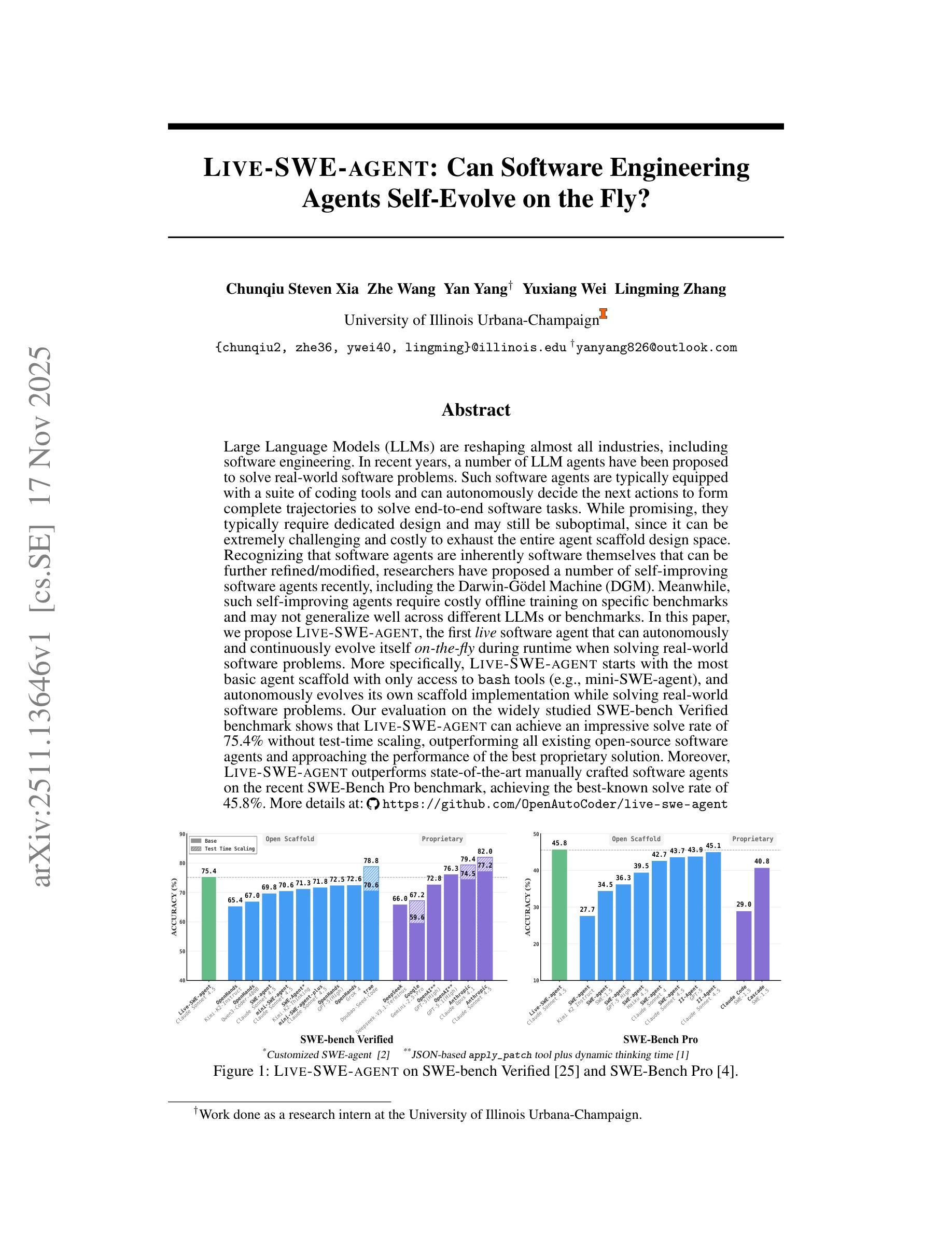 大型语言模型(LLM)正在重塑包括软件工程在内的几乎所有行业。近年来,人们提出了一系列LLM代理来解决现实世界中的软件问题。这些软件代理通常配备了一套编码工具,并能够自主决定下一步行动以形成完整的轨迹来解决端到端的软件任务。尽管有前景,但它们通常需要专门设计,并且可能仍然不够理想,因为穷尽整个代理架构的设计空间极具挑战性和成本高昂。研究人员已经认识到软件代理本质上是软件本身,可以进一步进行改进和修改,因此最近已经提出了一系列自我改进的软件代理,包括达尔文-歌德机器(DGM)。然而,这样的自我改进代理需要在特定基准上进行昂贵的离线训练,并且可能无法在不同的大型语言模型或基准上良好地推广。本文提出了Live-SWE-agent,这是第一个能够在解决现实世界软件问题时实时自主连续进化的软件代理。具体来说,Live-SWE-agent从最基础的代理架构开始,仅使用bash工具(例如,mini-SWE-agent),在解决现实世界软件问题时自主进化自己的架构实现。在广泛研究的SWE-bench验证基准上的评估表明,Live-SWE-agent在不进行测试时间缩放的情况下实现了令人印象深刻的解决率为75.4%,超越了所有现有的开源软件代理,并接近最佳的专有解决方案的性能。此外,Live-SWE-agent在最新的SWE-Bench Pro基准上超越了最先进的手动制作的软件代理,实现了最佳的解决率为45.8%。