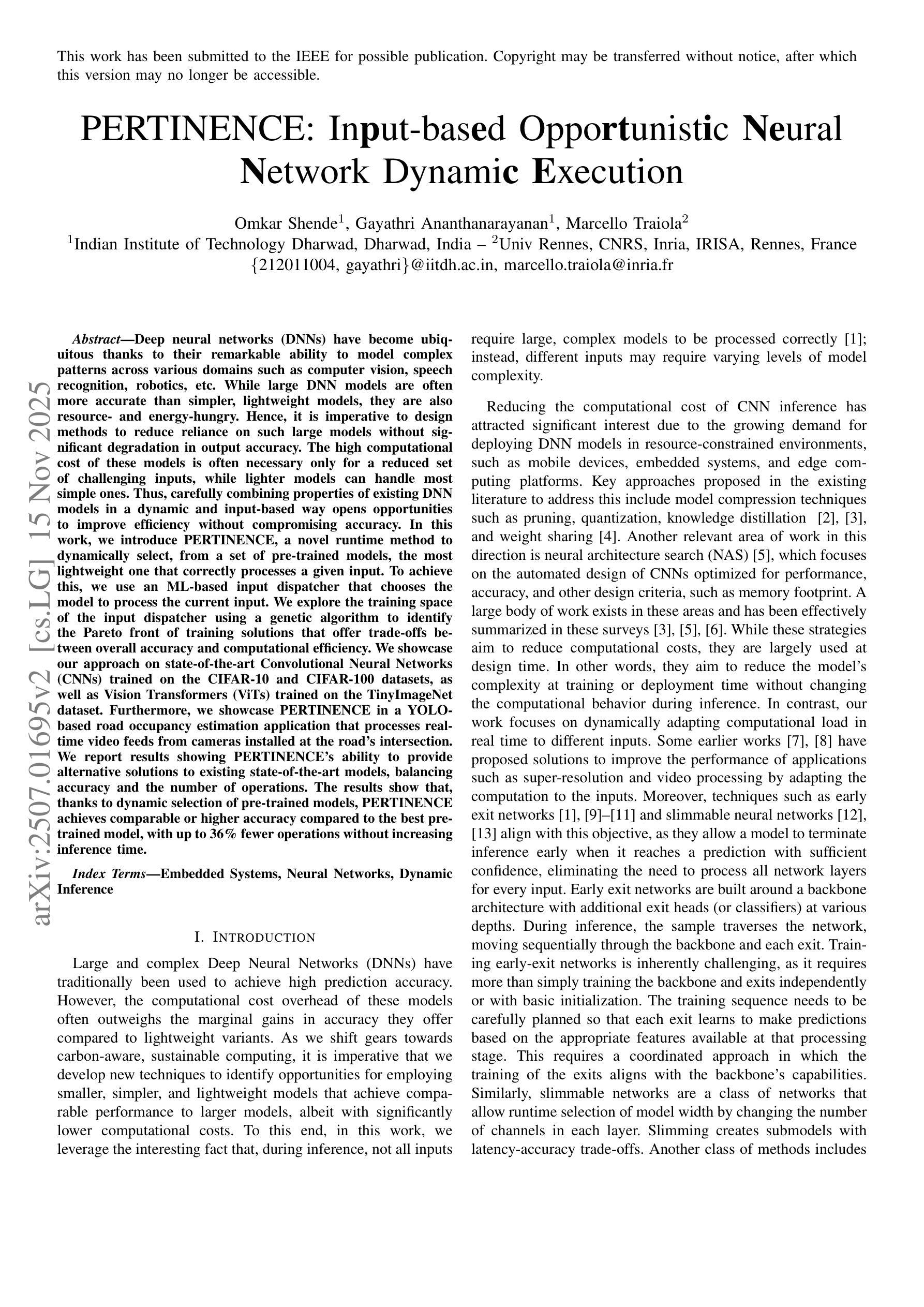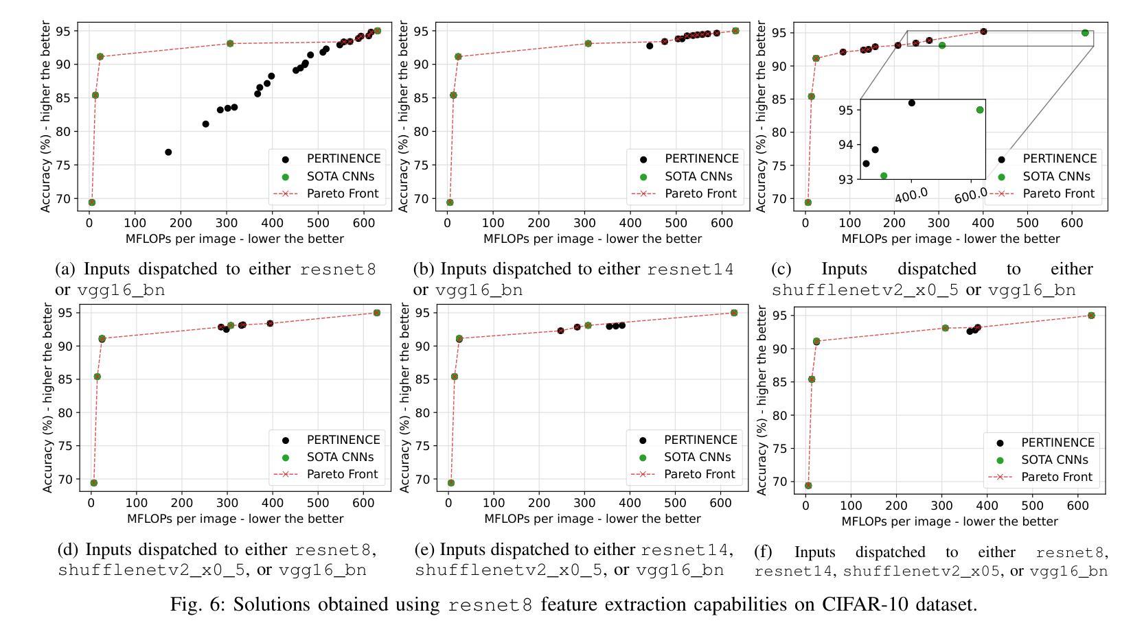 深度神经网络(DNN)由于其能够在计算机视觉、语音识别、机器人技术等领域对复杂模式进行建模的出色能力而无处不在。虽然大型DNN模型的准确性通常高于简单轻量级模型,但它们也需要大量的资源和能源。因此,设计方法来减少对这类大型模型的依赖,同时不会显著降低输出准确性,这是至关重要的。这些模型的高计算成本往往仅对于减少的具有挑战性的输入集是必要的,而较轻的模型可以处理大多数简单的输入。因此,以动态、基于输入的方式谨慎地结合现有DNN模型的属性,有助于提高效率而不影响准确性。在这项工作中,我们引入了PERTINENCE,这是一种新的在线方法,旨在分析输入特征复杂性,并从预训练模型集中动态选择最适合的模型来有效处理给定输入。为了实现这一点,我们采用遗传算法来探索基于机器学习的输入调度器的训练空间,使解决方案在整体准确性和计算效率之间取得平衡,朝着Pareto前沿收敛。我们在CIFAR-10和CIFAR-100上经过训练的最新卷积神经网络(CNN)以及TinyImageNet数据集上训练的视觉转换器(ViT)上展示了我们的方法。报告的结果显示了PERTINENCE在准确性和运算次数之间的权衡方面为现有最先进的模型提供替代解决方案的能力。通过在有相同任务的模型中做出选择,PERTINENCE可以在保持相当或更高的准确率的同时,减少高达36%的操作。