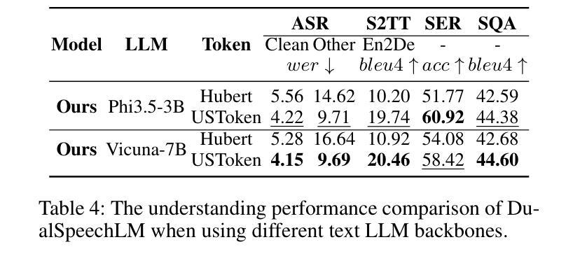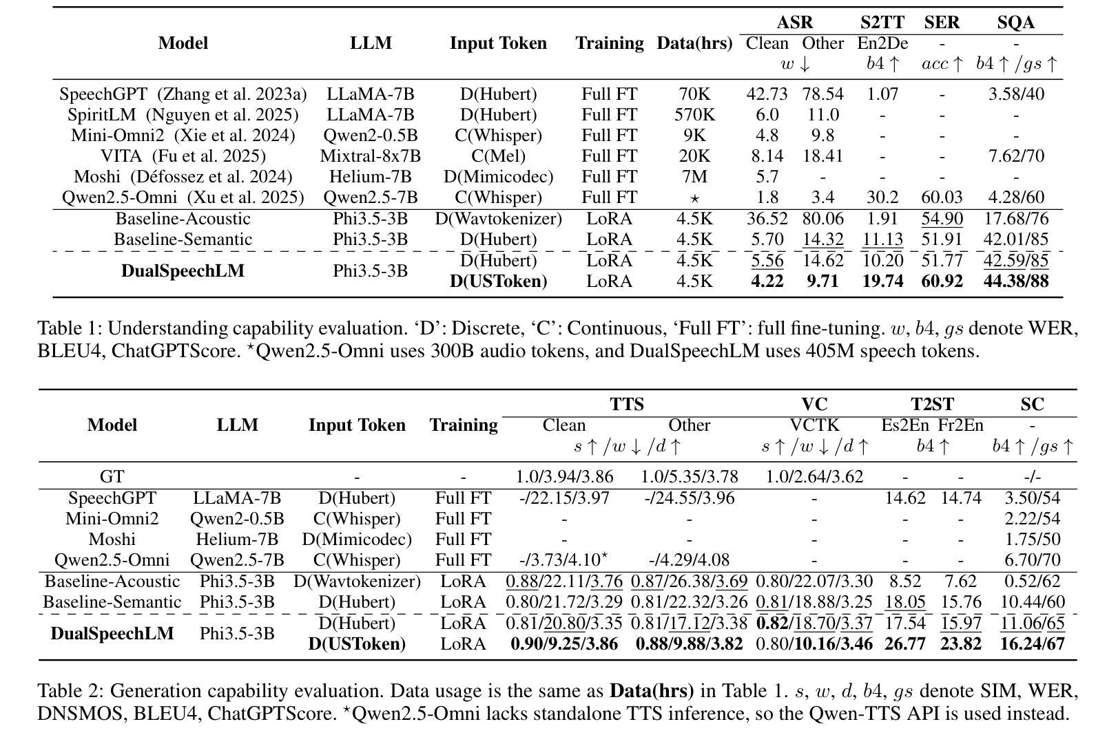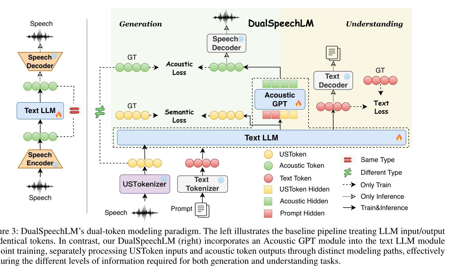 - 介绍DualSpeechLM框架,统一建模语音理解和生成能力,使用USToken和音频令牌。