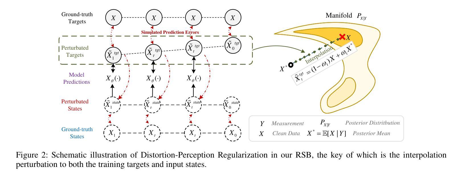扩散模型是解决逆问题的强大生成框架。然而,它们仍然面临两个主要挑战:1)失真与感知之间的权衡,在提高感知质量的同时往往会降低重建的保真度;2)曝光偏差问题,训练与推理之间的输入不匹配导致预测误差累积并降低了重建质量。针对上述问题,我们在本文中提出了一种正则化Schrödinger Bridge(RSB),这是针对逆问题量身定制的Schrödinger Bridge的一种适应。RSB采用了一种新型的正则化训练策略,同时扰动输入状态和目标,通过使模型暴露于模拟预测误差来有效缓解曝光偏差,并通过精心设计后验均值进行插值来缓解失真。针对语音增强的两个典型逆问题的广泛实验表明,RSB优于最新方法,显著提高了失真指标并有效降低了曝光偏差。