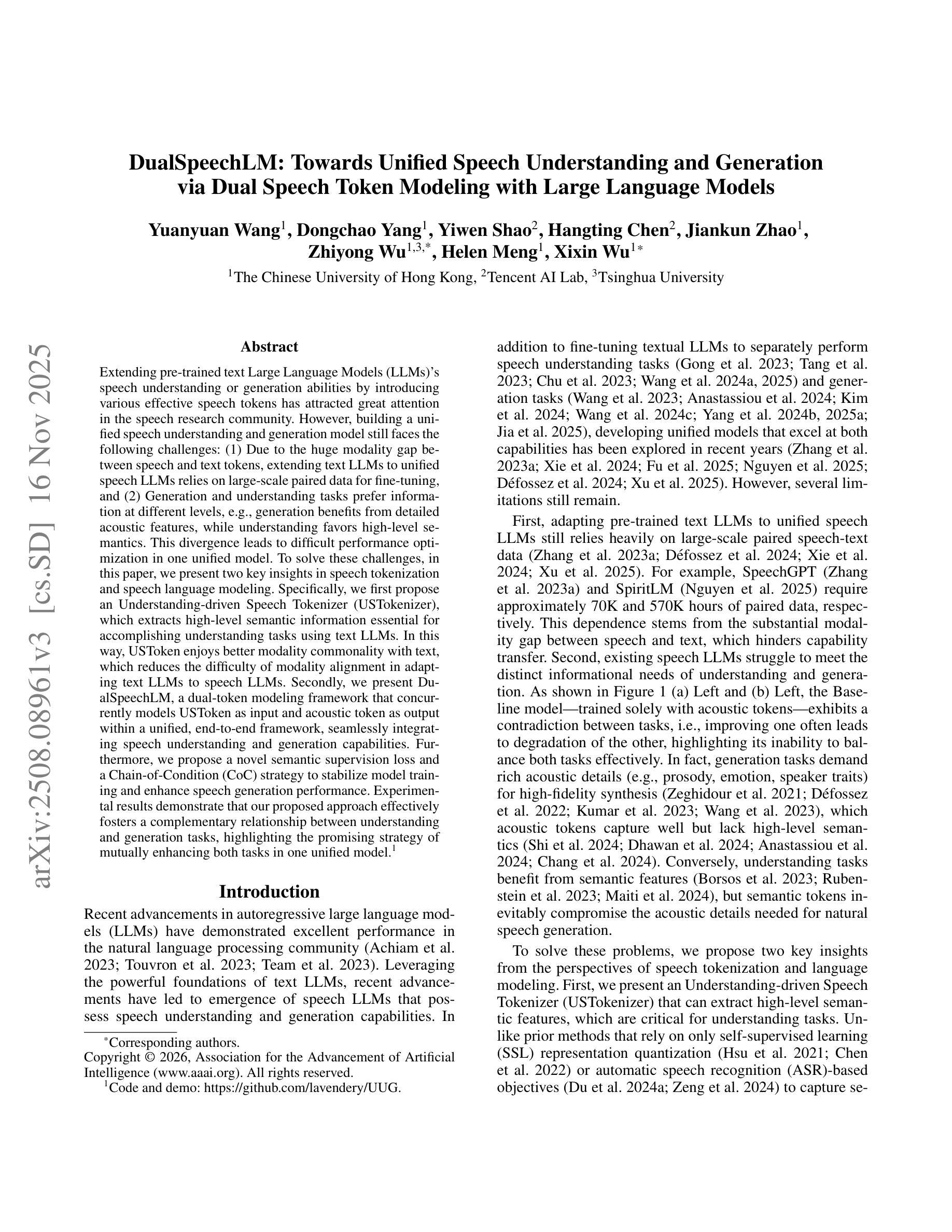 将预训练的文本大型语言模型(LLMs)的语音理解或生成能力通过引入各种有效的语音标记进行扩展,在语音领域引起了极大的关注。然而,构建统一的语音理解和生成模型仍然面临以下挑战:(1)由于语音和文本标记之间存在巨大的模态差距,将文本LLMs扩展到统一的语音LLMs依赖于大规模配对数据进行微调;(2)生成和理解任务偏好不同层级的信息,例如,生成受益于详细的声学特征,而理解则偏向于高级语义。这种分歧导致在一个统一模型中难以进行性能优化。为了解决这些挑战,本文提出了语音标记化和语音语言模型的两个关键见解。具体来说,我们首先提出了一种理解驱动的语音标记器(USTokenizer),它使用文本LLMs提取完成理解任务所需的高级语义信息。通过这种方式,USToken与文本的模态共性更好,降低了将文本LLMs适应到语音LLMs时的模态对齐难度。其次,我们提出了DualSpeechLM,这是一个双标记建模框架,该框架在一个统一、端到端的框架内,同时以USToken作为输入和音频标记作为输出进行建模,无缝集成了语音理解和生成能力。此外,我们提出了一种新的语义监督损失和条件链(CoC)策略,以稳定模型训练并增强语音生成性能。实验结果表明,我们提出的方法有效地促进了理解与生成任务之间的互补关系,突显了在统一模型中相互增强这两个任务的策略前景。