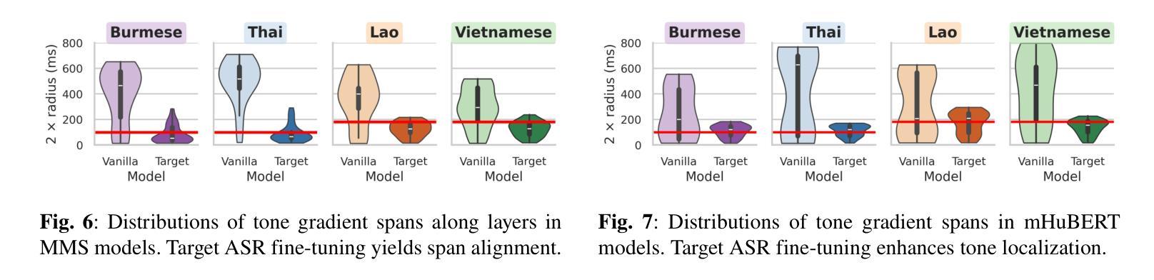语音模型的自监督学习对音调处理不够充分,特别是对于非汉语语种的研究尚浅。本文通过探讨四种拥有复杂且多样的音调系统的语言,包括缅甸语、泰语、老挝语和越南语,探究了语音模型如何识别语音和在不同资源条件下的迁移效果。本文认为语音模型捕捉音调信息的时长大约为缅甸语和泰语的100毫秒左右,而老挝语和越南语则为约180毫秒。对微调后的语音模型的测试和梯度分析显示,不同下游任务之间的音调迁移存在差异:自动语音识别微调与特定语言的音调提示对齐,而韵律和语音相关任务则使模型偏向于过长的时长。这表明下游任务对音调迁移产生影响,进而突显了语音模型处理音调的时空特征。