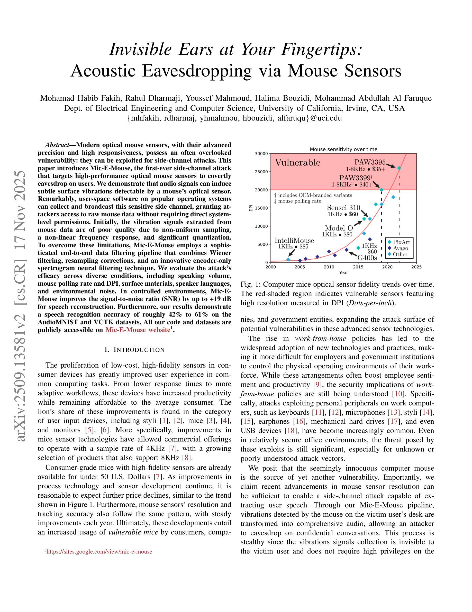 Modern optical mouse sensors, with their advanced precision and high responsiveness, possess an often overlooked vulnerability: they can be exploited for side-channel attacks. This paper introduces Mic-E-Mouse, the first-ever side-channel attack that targets high-performance optical mouse sensors to covertly eavesdrop on users. We demonstrate that audio signals can induce subtle surface vibrations detectable by a mouse’s optical sensor. Remarkably, user-space software on popular operating systems can collect and broadcast this sensitive side channel, granting attackers access to raw mouse data without requiring direct system-level permissions. Initially, the vibration signals extracted from mouse data are of poor quality due to non-uniform sampling, a non-linear frequency response, and significant quantization. To overcome these limitations, Mic-E-Mouse employs a sophisticated end-to-end data filtering pipeline that combines Wiener filtering, resampling corrections, and an innovative encoder-only spectrogram neural filtering technique. We evaluate the attack’s efficacy across diverse conditions, including speaking volume, mouse polling rate and DPI, surface materials, speaker languages, and environmental noise. In controlled environments, Mic-E-Mouse improves the signal-to-noise ratio (SNR) by up to +19 dB for speech reconstruction. Furthermore, our results demonstrate a speech recognition accuracy of roughly 42% to 61% on the AudioMNIST and VCTK datasets. All our code and datasets are publicly accessible on https://sites.google.com/view/mic-e-mouse.