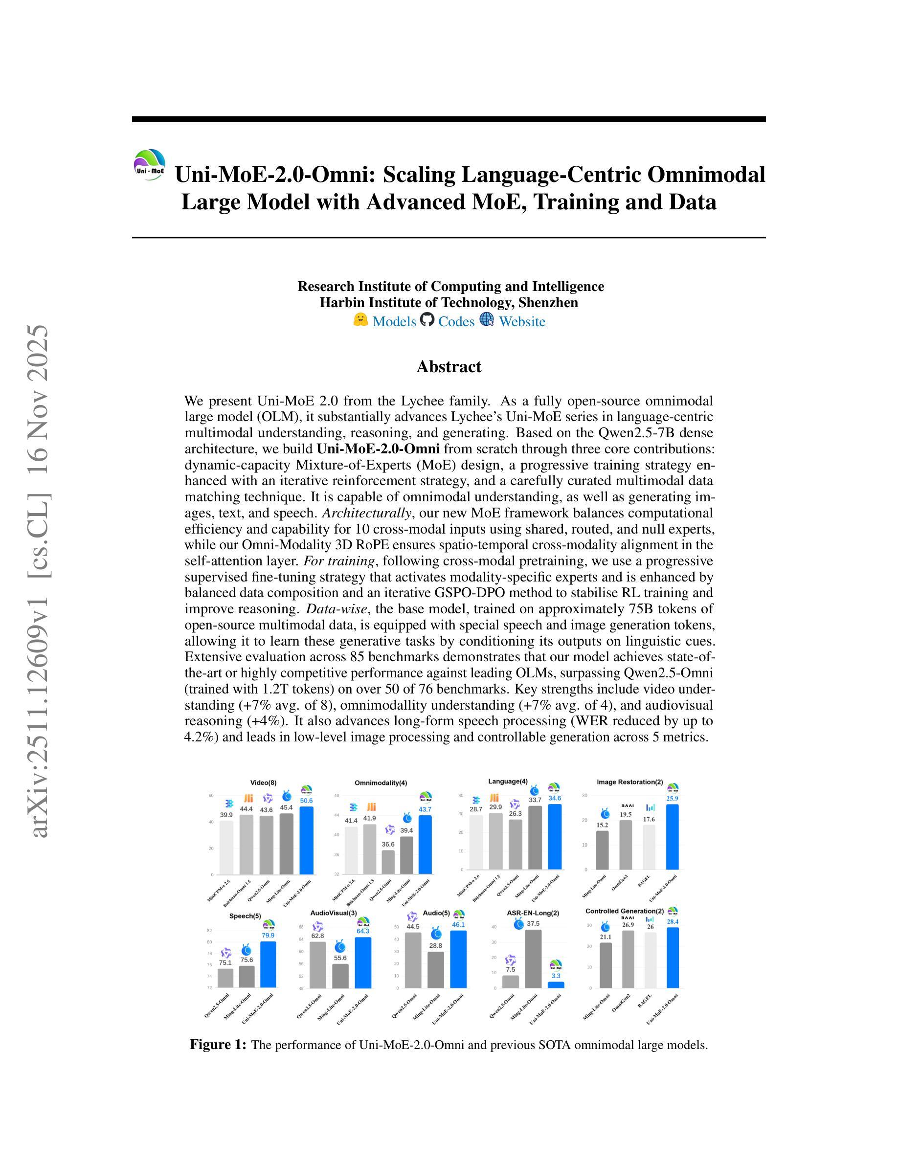 我们在此介绍来自Lychee家族的Uni-MoE 2.0。作为一款全开源的多模态大型模型(OLM),它极大地推动了Lychee的Uni-MoE系列在语言为中心的多模态理解、推理和生成方面的进展。基于Qwen2.5-7B的密集架构,我们通过三个核心贡献从头构建了Uni-MoE-2.0-Omni:动态容量专家混合(MoE)设计、采用迭代增强策略的渐进训练策略以及精心策划的多模态数据匹配技术。它能够进行多模态理解,并能够生成图像、文本和语音。在结构上,我们新的MoE框架通过共享、路由和空专家在10个跨模态输入之间平衡计算效率和能力;我们的Omni-Modality 3D RoPE则确保自注意力层中的时空跨模态对齐。在训练方面,我们在跨模态预训练之后采用渐进的监督微调策略,该策略能够激活模态特定专家,并通过平衡数据组合和迭代GSPO-DPO方法来稳定强化学习训练和提高推理能力。在数据方面,基础模型在大约75B个开源多模态数据标记上进行训练,并配备了特殊的语音和图像生成标记,这使其能够通过语言线索来生成这些任务输出。在85个基准测试上的广泛评估表明,我们的模型达到了最新技术水平或在领先的OLM中具有竞争力,在超过76个基准测试中的50多个测试中超过了使用1.2T标记训练的Qwen2.5-Omni。关键优势包括视频理解(+7%的平均值达到八项指标)、多模态理解(+七项平均值达四项)、视听推理(+4%)等。同时,它还推动了长形式语音处理的发展(将字错误率降低4.2%),并在五个指标中处于图像处理和可控生成的领先地位。
