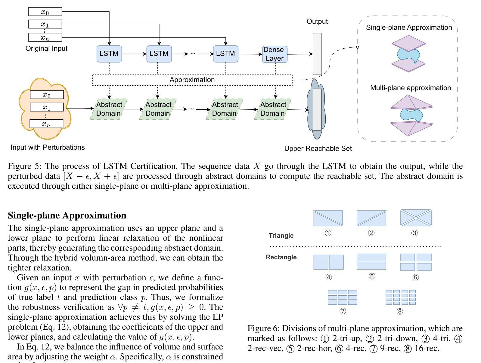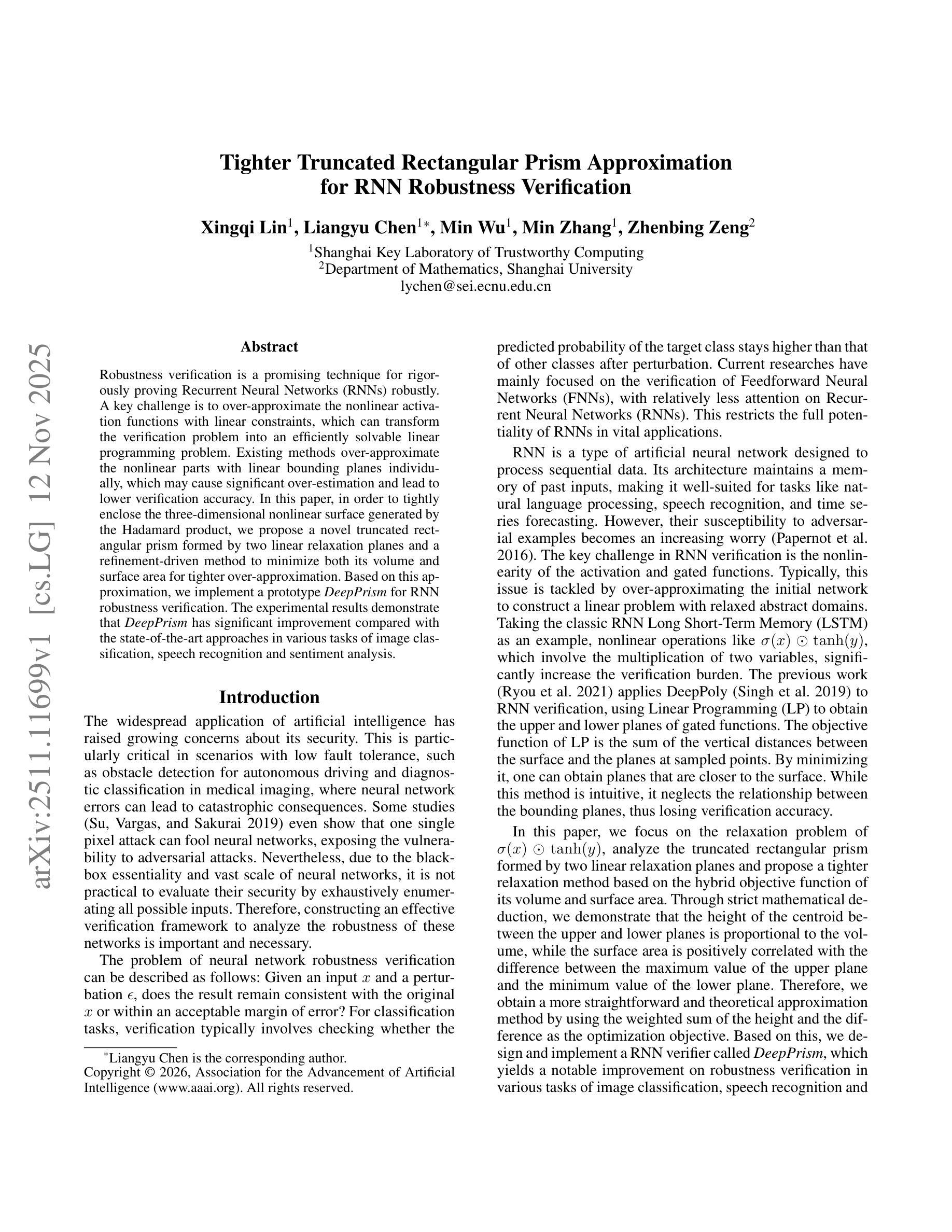 该文介绍了一种基于深度学习的鲁棒性验证技术,特别是针对循环神经网络(RNNs)的鲁棒性验证。文章提出了一种新的方法来解决非线性激活函数过度近似的问题,通过将非线性部分紧密地封装在一个由两个线性松弛平面和一个优化驱动的截断矩形棱柱内,以最小化其体积和表面积实现更紧密的近似。基于这种近似方法,文章实现了一个名为DeepPrism的原型用于RNN鲁棒性验证,并在图像分类、语音识别和情感分析等任务上取得了显著的改进。