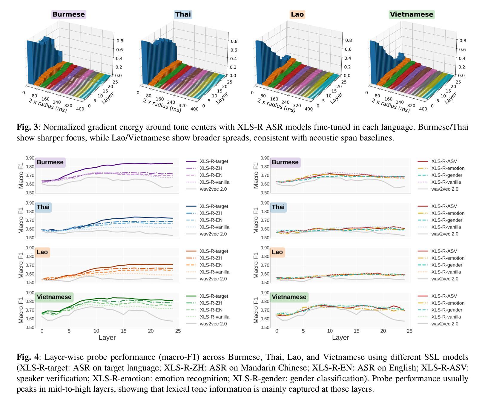 语音语调在许多语言中至关重要,但在自监督学习(SSL)的语音模型中,特别是在非普通话语言中的探索仍然不足。我们研究了四种具有复杂和多样化的语调系统的语言:缅甸语、泰语、老挝语和越南语,以研究此类模型在多大程度上能够识别语调,以及在资源匮乏的条件下如何进行迁移。作为基准参考,我们估计缅甸语和泰语的语调线索时间跨度约为100毫秒,而老挝语和越南语的语调线索时间跨度约为180毫秒。对微调SSL模型的探针和梯度分析显示,语调迁移受下游任务的影响:自动语音识别微调与特定语言的语调线索对齐,而韵律和语音相关任务则使模型偏向于过长的跨度。这些发现表明,语调迁移受下游任务的影响,突出了任务对语调建模中时间重点的影响。