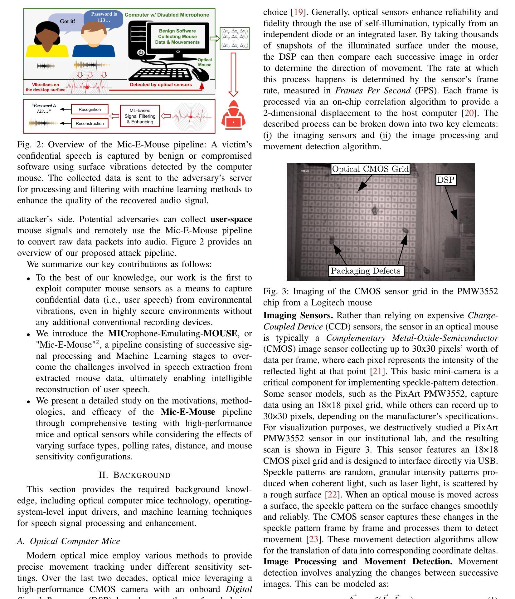 - 现代光学鼠标传感器存在侧信道攻击的风险,本文首次介绍了针对此的Mic-E-Mouse攻击。