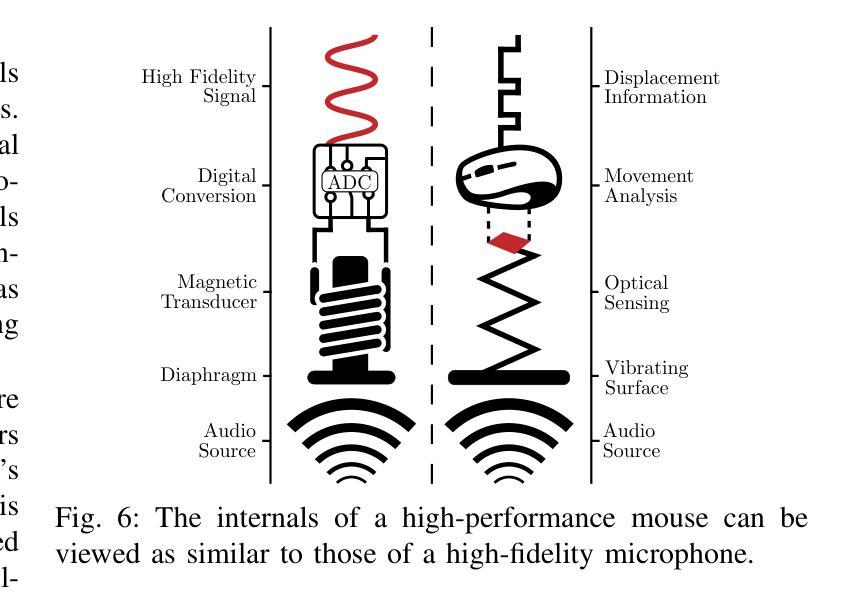 现代光学鼠标传感器以其高级精度和高响应性而闻名,但它们存在一个经常被忽视的漏洞:它们可能被用于侧信道攻击。本文介绍了Mic-E-Mouse,这是一种针对高性能光学鼠标传感器的新型侧信道攻击,可以秘密监听用户。我们证明音频信号会诱发鼠标光学传感器可以检测到的微妙表面振动。值得注意的是,流行操作系统上的用户空间软件可以收集和广播这种敏感的侧信道信息,从而允许攻击者访问原始鼠标数据,而无需获得直接的系统级权限。由于非均匀采样、非线性频率响应和显著的量化,最初从鼠标数据中提取的振动信号质量较差。为了克服这些局限性,Mic-E-Mouse采用了一种先进的端到端数据过滤管道,结合了Wiener滤波、重采样校正以及创新的仅编码器光谱神经过滤技术。我们评估了攻击在不同条件下的有效性,包括说话音量、鼠标轮询率和DPI、表面材料、说话人的语言和环境噪音。在受控环境中,Mic-E-Mouse提高了信号与噪声比(SNR),语音重建提高了高达+19分贝。此外,我们的研究结果在AudioMNIST和VCTK数据集上显示出约42%至61%的语音识别准确率。我们的所有代码和数据集可在https://sites.google.com/view/mic-e-mouse上公开访问。