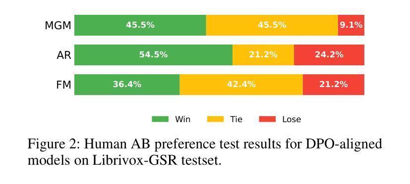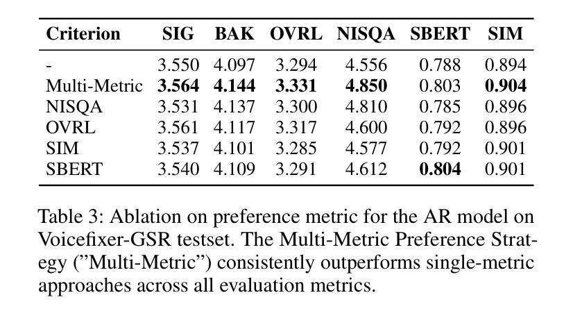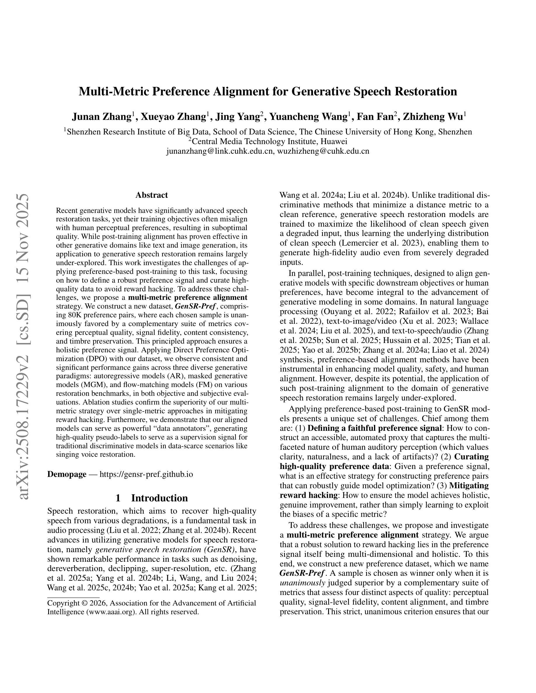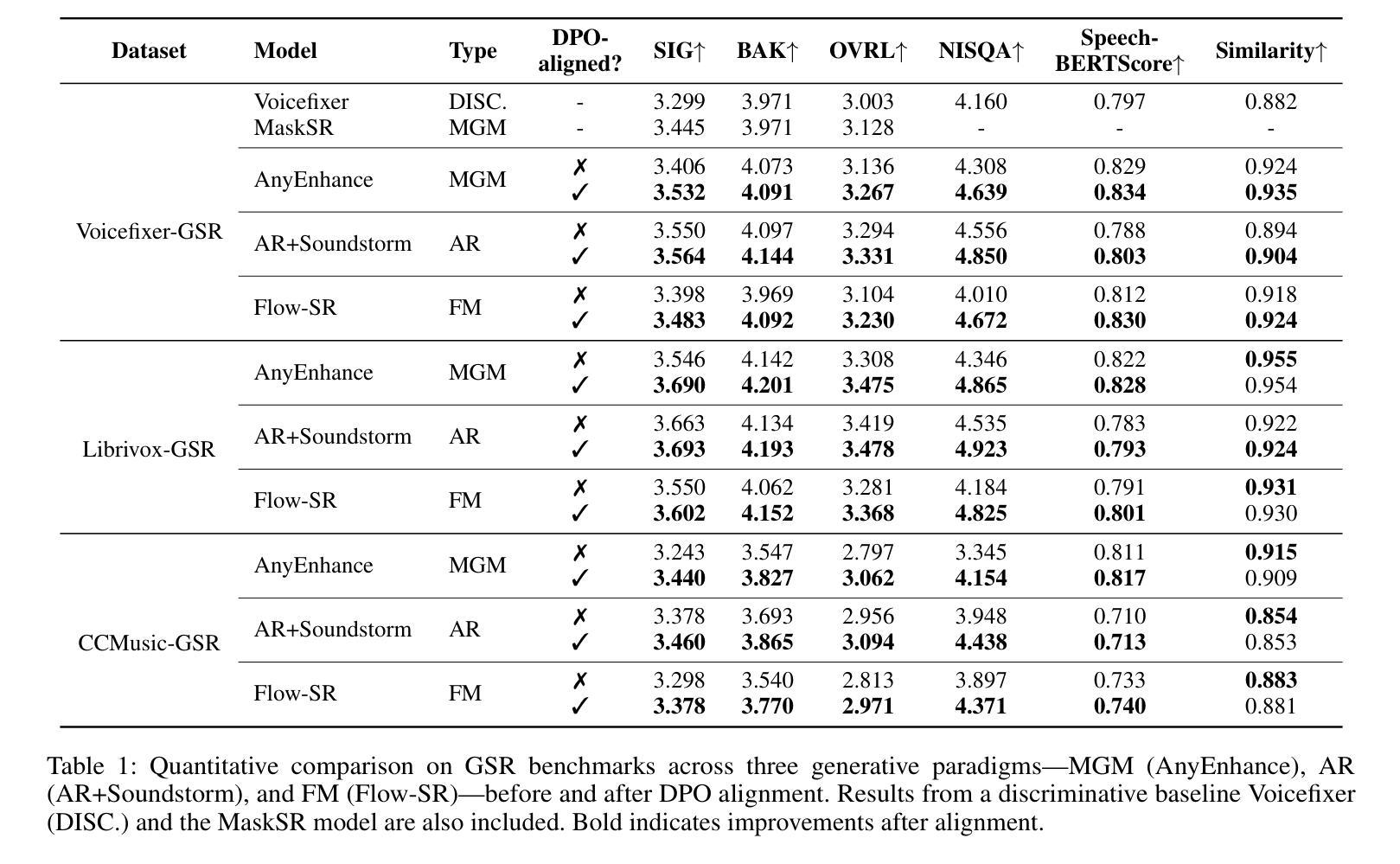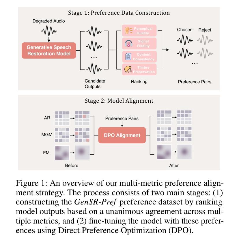 近期生成模型在语音修复任务上取得了显著进展,但它们的训练目标往往与人类感知偏好不一致,导致质量不佳。虽然基于偏好的后训练对齐在文本和图像生成等其他生成领域已经证明是有效的,但其在生成语音修复中的应用仍然在很大程度上未被探索。本研究探讨了将基于偏好的后训练应用于这一任务所面临的挑战,重点关注如何定义稳健的偏好信号以及筛选高质量数据以避免奖励操纵。为了应对这些挑战,我们提出了一种多指标偏好对齐策略。我们构建了一个新的数据集GenSR-Pref,包含80万对偏好样本,每个被选中的样本都由一套涵盖感知质量、信号保真度、内容一致性和音色保持的互补指标一致认可。这种有原则的方法确保了全面的偏好信号。使用我们的数据集进行直接偏好优化(DPO),我们在三种不同的生成范式中观察到了一致且显著的性能提升:包括自回归模型(AR)、遮罩生成模型(MGM)和流匹配模型(FM)在各种修复基准测试上的表现,在客观和主观评估中均有提升。消融研究证实,我们的多指标策略在缓解奖励操纵方面优于单指标方法。此外,我们证明,我们的对齐模型可以作为强大的“数据注释器”,生成高质量伪标签,作为数据稀缺场景(如歌声修复)中传统判别模型的监督信号。Demo Page:https://gensr-pref.github.io