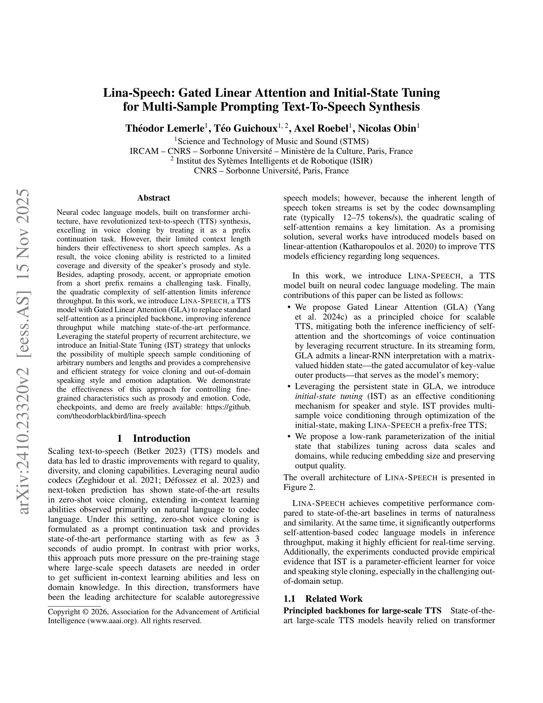 神经网络编码语言模型在文本转语音(TTS)合成领域实现了革命性的突破,尤其在语音克隆方面表现出卓越性能。然而,其有限的上下文长度限制了短语音样本的有效性,导致语音克隆能力在说话者的语调和风格方面的覆盖范围和多样性有限。此外,从短前缀中适应语调、口音或适当的情绪仍然是一项具有挑战性的任务。本文介绍了一种名为Lina-Speech的TTS模型,采用门控线性注意力(GLA)替代标准自注意力机制,提高了推理速度并保持了最新性能。我们引入了一种初始状态调整(IST)策略,利用递归架构的状态特性,实现了任意数量和长度的多个语音样本条件化,为语音克隆和跨域语音风格和情感适应提供了全面有效的策略。