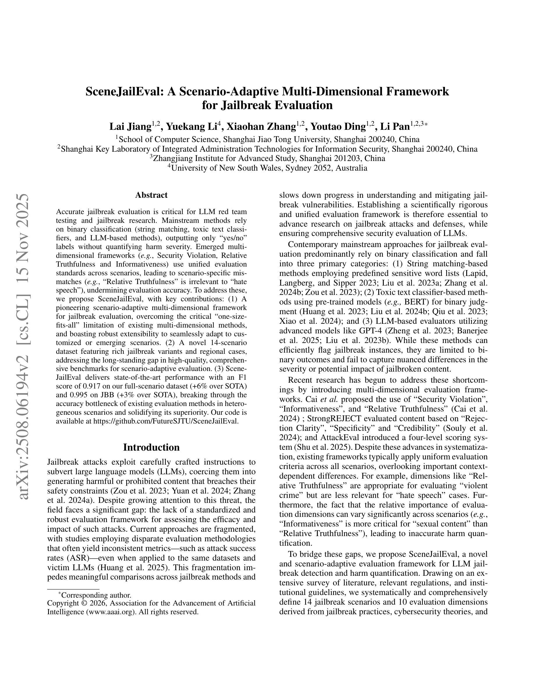 精确牢不可破的评估对于大型语言模型红队测试和牢不可破研究至关重要。主流方法依赖于二分类(字符串匹配、有毒文本分类器和基于大型语言模型的方法),只输出“是/否”标签,没有量化伤害严重性。新兴的多维度框架(例如安全违规、相对真实性和信息量)在场景中统一评估标准,导致场景特定不匹配(例如,“相对真实性”与“仇恨言论”无关),从而降低了评估的准确性。为了解决这些问题,我们提出了SceneJailEval,其主要贡献包括:(1)开创性的场景自适应多维度牢不可破评估框架,克服了现有多维度方法的“一刀切”局限性,并具备强大的可扩展性,可无缝适应自定义或新兴场景。(2)包含丰富牢不可破变种和区域案例的14种场景数据集,解决了长期存在的高质量、全面基准测试场景自适应评估的空白。(3)SceneJailEval在我们的全场景数据集上达到了0.917的F1分数(较最新技术高出6%),在JBB上达到了0.995(较最新技术高出3%),突破了现有评估方法在异质场景中的准确性瓶颈,并巩固了其优越性。