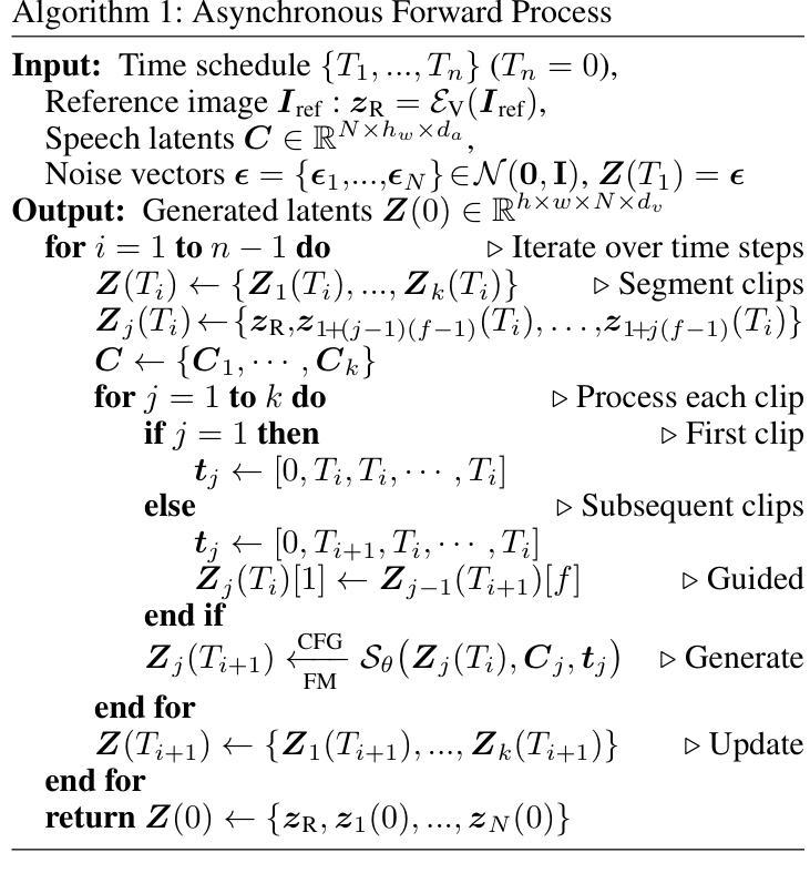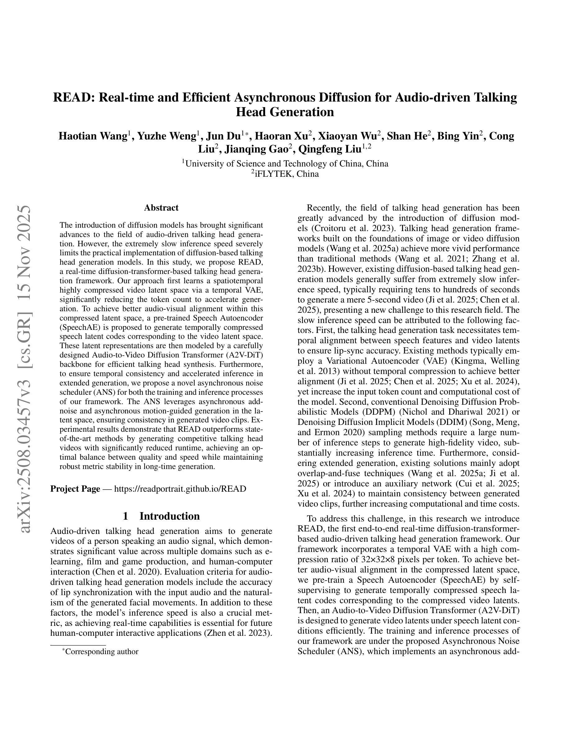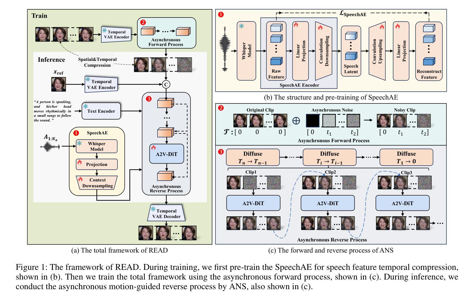 扩散模型的引入为音频驱动的有声视频头部生成领域带来了重大进展。然而,由于其极慢的推理速度,基于扩散的有声视频头部生成模型的实际应用受到了严重限制。本研究提出了READ,一个基于实时扩散变压器的有声视频头部生成框架。我们的方法首先通过时间VAE学习一个时空高度压缩的视频潜在空间,大大减少令牌计数以加速生成。为了在这个压缩的潜在空间内实现更好的音视频对齐,我们提出了一个预训练的自编码器语音自动编码器(SpeechAE)来生成与视频潜在空间相对应的时间压缩语音潜在代码。这些潜在表示然后通过精心设计的音频到视频扩散变压器(A2V-DiT)主干进行建模,以实现高效的有声视频头部合成。此外,为了确保扩展生成的时序一致性和加速推理,我们为框架的训练和推理过程提出了新型异步噪声调度器(ANS)。ANS利用潜伏空间中的异步添加噪声和异步运动引导生成,确保生成的视频片段的一致性。实验结果表明,READ在生成具有竞争力的有声视频头部视频方面优于最先进的方法,在保持长时间生成稳健的度量稳定性的同时实现了质量和速度的最优平衡,显著减少了运行时间。
