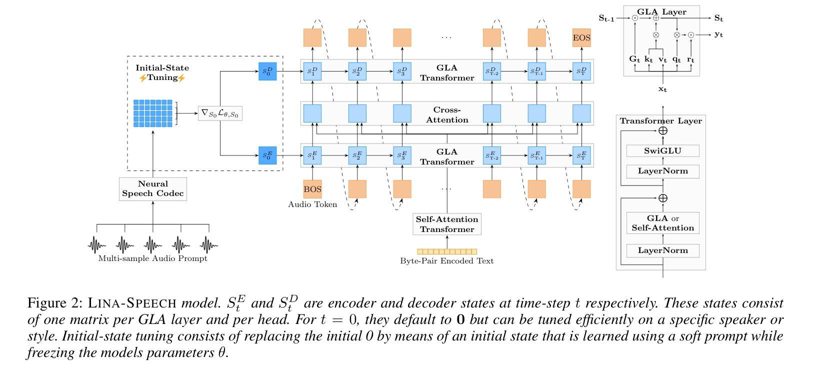 基于神经网络编码器的语言模型,建立在Transformer架构之上,已经彻底改变了文本到语音(TTS)的合成方式,通过将语音克隆视为前缀延续任务,其在语音克隆方面表现出卓越的性能。然而,其有限的上下文长度限制了它们在短语音样本中的有效性。因此,语音克隆能力仅限于对说话人的语调和风格的有限覆盖和多样性。此外,从简短的前缀中适应语调、口音或适当的情绪仍然是一项具有挑战性的任务。最后,自注意力的二次复杂性限制了推理吞吐量。在这项工作中,我们介绍了Lina-Speech,这是一种带有门控线性注意力(GLA)的TTS模型,它替代了标准的自注意力作为核心架构,提高了推理吞吐量,同时匹配了最先进的技术性能。我们利用递归架构的stateful属性,引入了一种初始状态调整(IST)策略,这种策略开启了任意数量和长度的多个语音样本条件的可能性,并为语音克隆以及域外说话风格和情感适应提供了全面而有效的策略。我们证明了这种方法在控制细微特征(如语调和情感)方面的有效性。相关代码、检查点和演示可免费获取:https://github.com/theodorblackbird/lina-speech