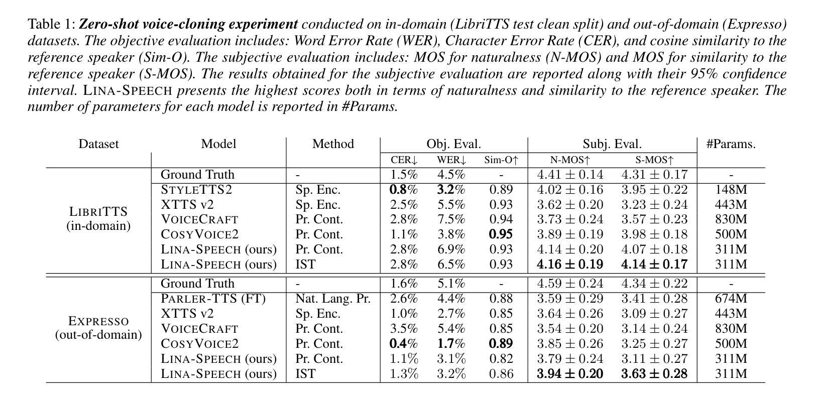- Lina-Speech为语音克隆和跨域语音风格及情感适应提供了全面有效的策略。