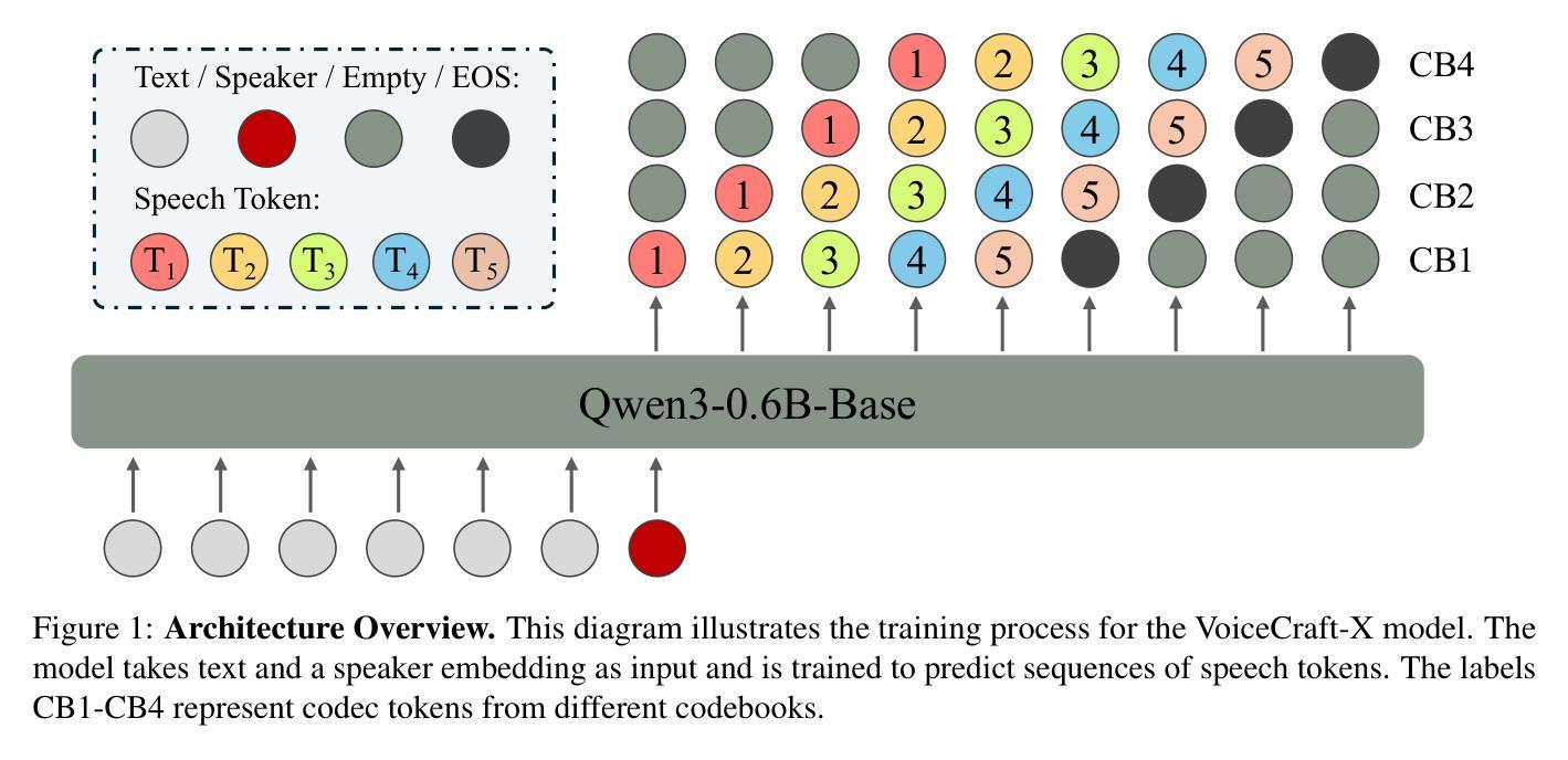 我们推出VoiceCraft-X,这是一款自动回归神经编码语言模型,它统一了跨11种语言的多语种语音编辑和零样本文本到语音(TTS)合成,这11种语言包括英语、普通话、韩语、日语、西班牙语、法语、德语、荷兰语、意大利语、葡萄牙语和波兰语。VoiceCraft-X利用Qwen3大型语言模型进行无音素跨语言文本处理,并采用一种新的令牌重排机制,通过文本和语音令牌的时序对齐,将两个任务作为单个序列生成问题来处理。该模型生成高质量、自然语音的语音,可以在一个框架内无缝地创建新的音频或编辑现有的录音。VoiceCraft-X在不同的语言环境中表现出稳健的性能,即使在每语言数据有限的情况下也是如此,这突显出统一自动回归方法在推动复杂、现实的多语种语音应用方面的力量。音频样本可在https://zhishengzheng.com/voicecraft-x/找到。
