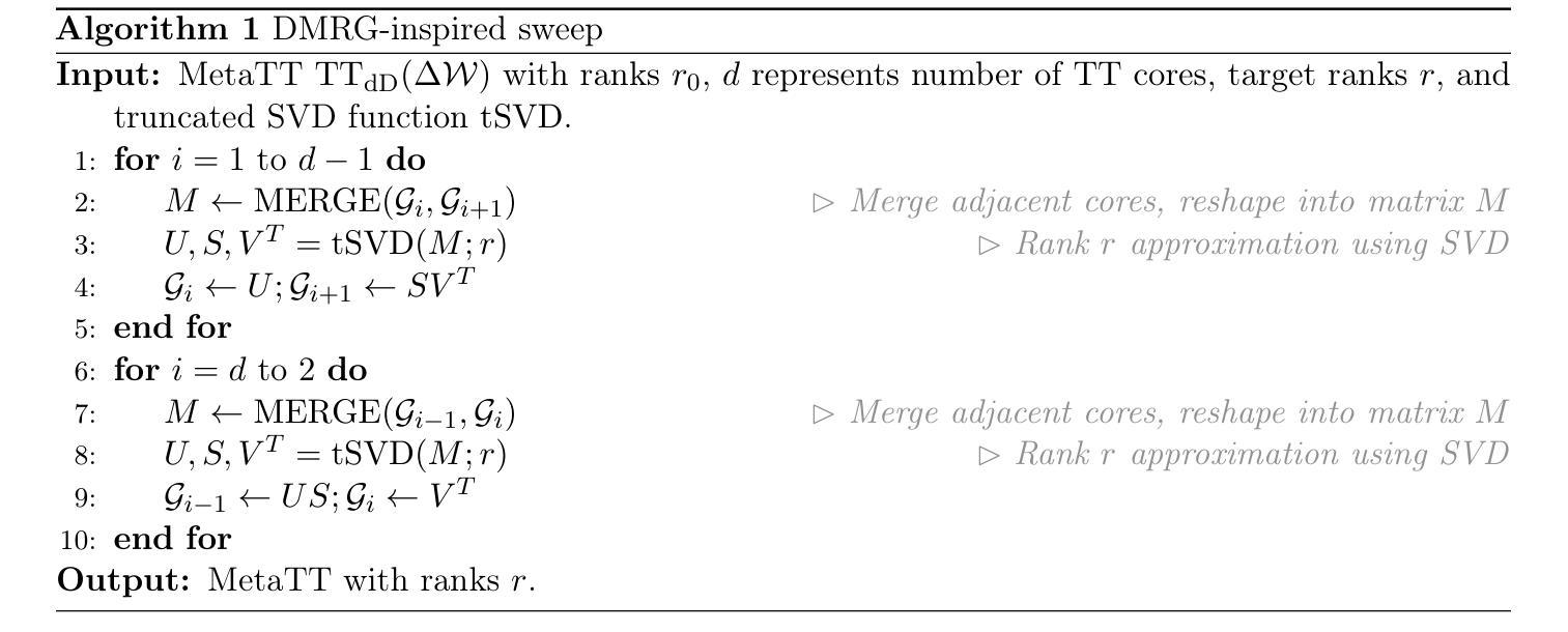 - MetaTT通过因子分解实现参数高效的模型适应,使用单个共享的TT对变压器子模块进行索引。